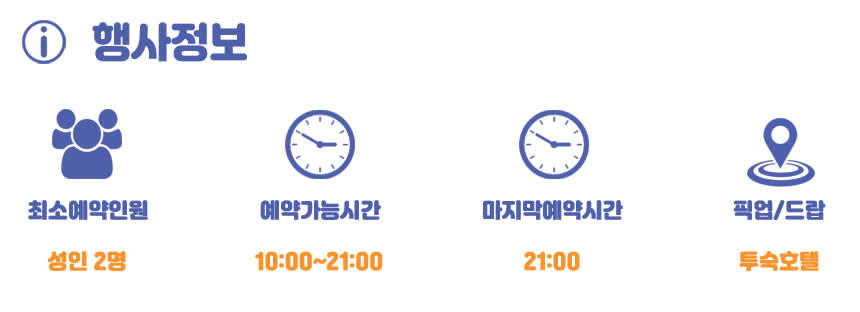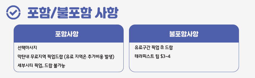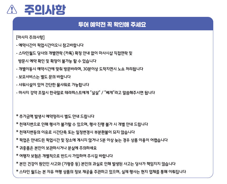 📌 [주의 사항] - 예약시간이 픽업 시간이오니 참고 바랍니다. - 개별 이동 시 예약시간에 맞춰 방문바라며, 30분 이상 도착 지연 시 노쇼 처리됩니다. - 보모서비스는 별도 문의 바랍니다. - 샤워시설이 있어 간단한 물 샤워로 가능합니다. - 마사지 강약 조절 시 한국말로 테라피스트에게 '살살/'쎄게'라고 말씀해주시면 됩니다. - 에티켓 팁은 1시간 마사지 1$ / 1시간 30분 2$ / 2시간 3$입니다. - 60분 마사지는 무료 픽업구간 1회만 제공됩니다. - 여행자 보험은 개별적으로 반드시 가입 바랍니다. - 스타인월드는 본 자유 여행 상품의 정보 제공을 주관하고 있으며, 실제 행사는 현지 업체를 통해 이뤄집니다.