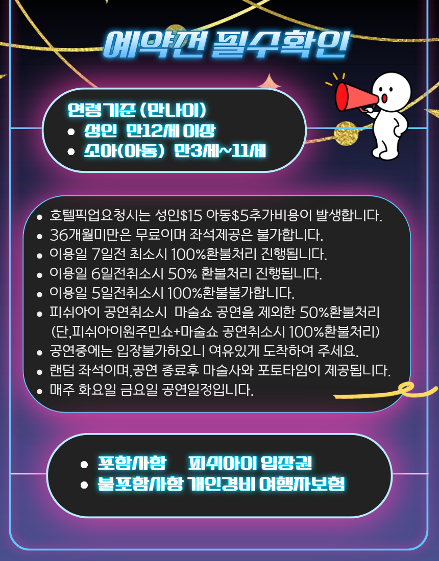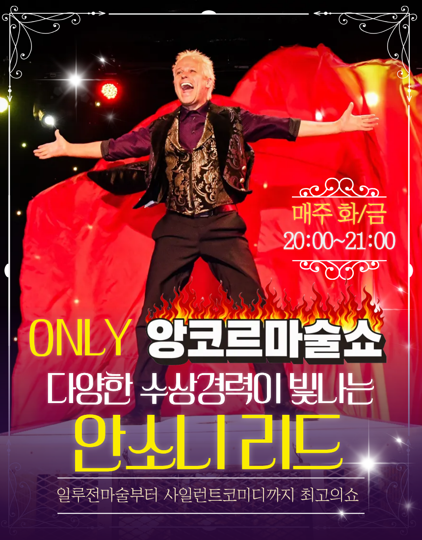 피쉬아이 원주민쇼와 마술쇼가 어우러져, 활기찬 2시간 동안 잊지 못할 시간을 선사합니다.