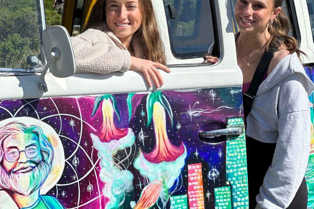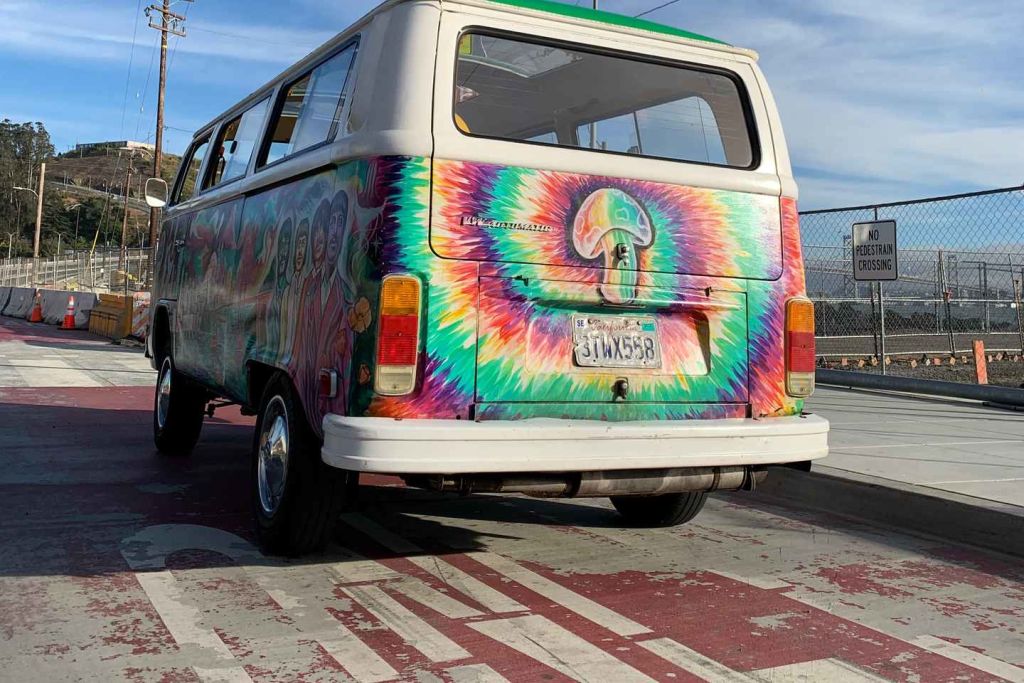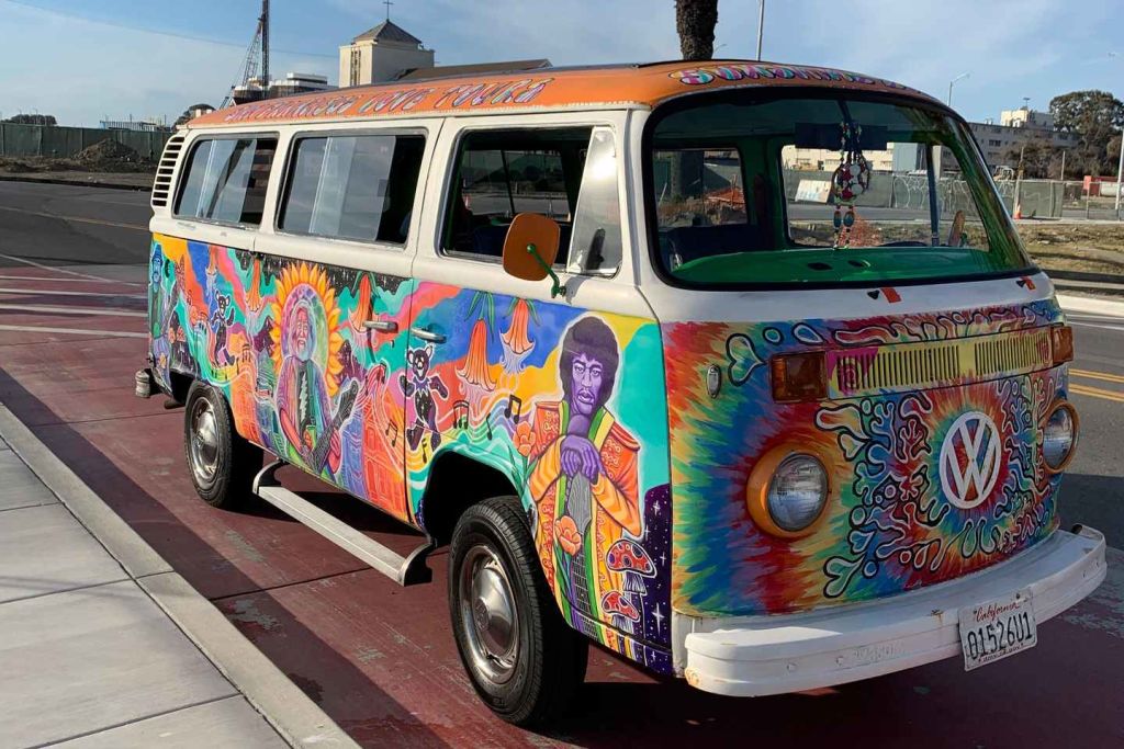 상징적인 빈티지 핸드 페인팅 폭스바겐 히피 버스를 타보세요!