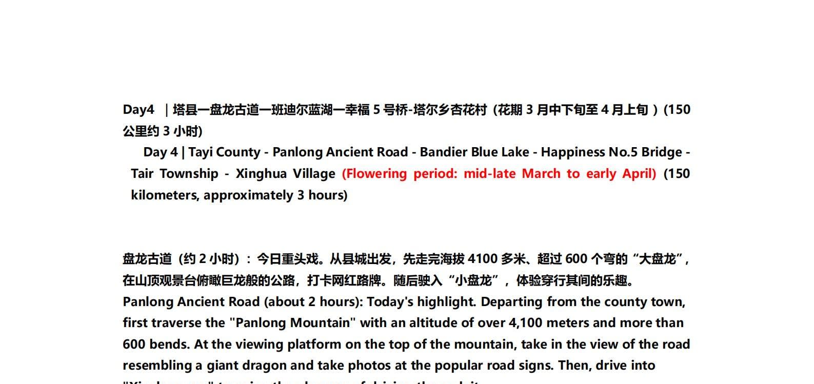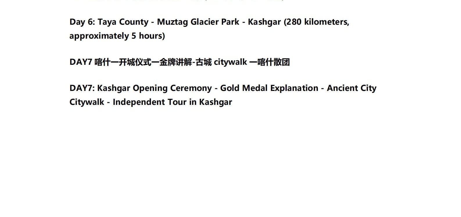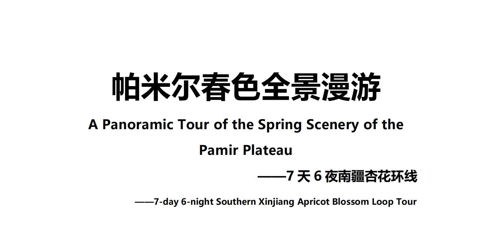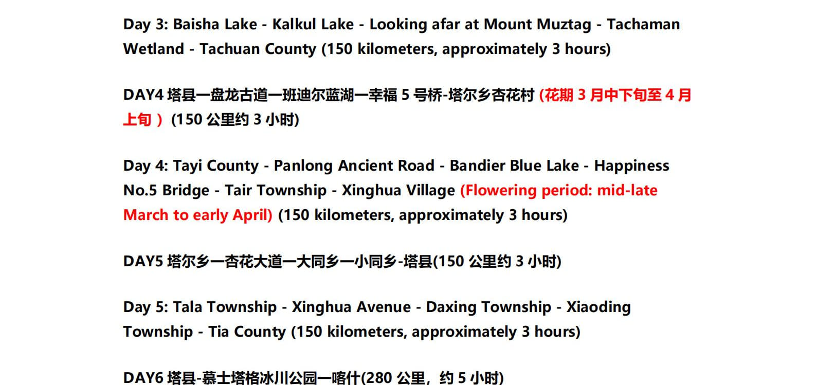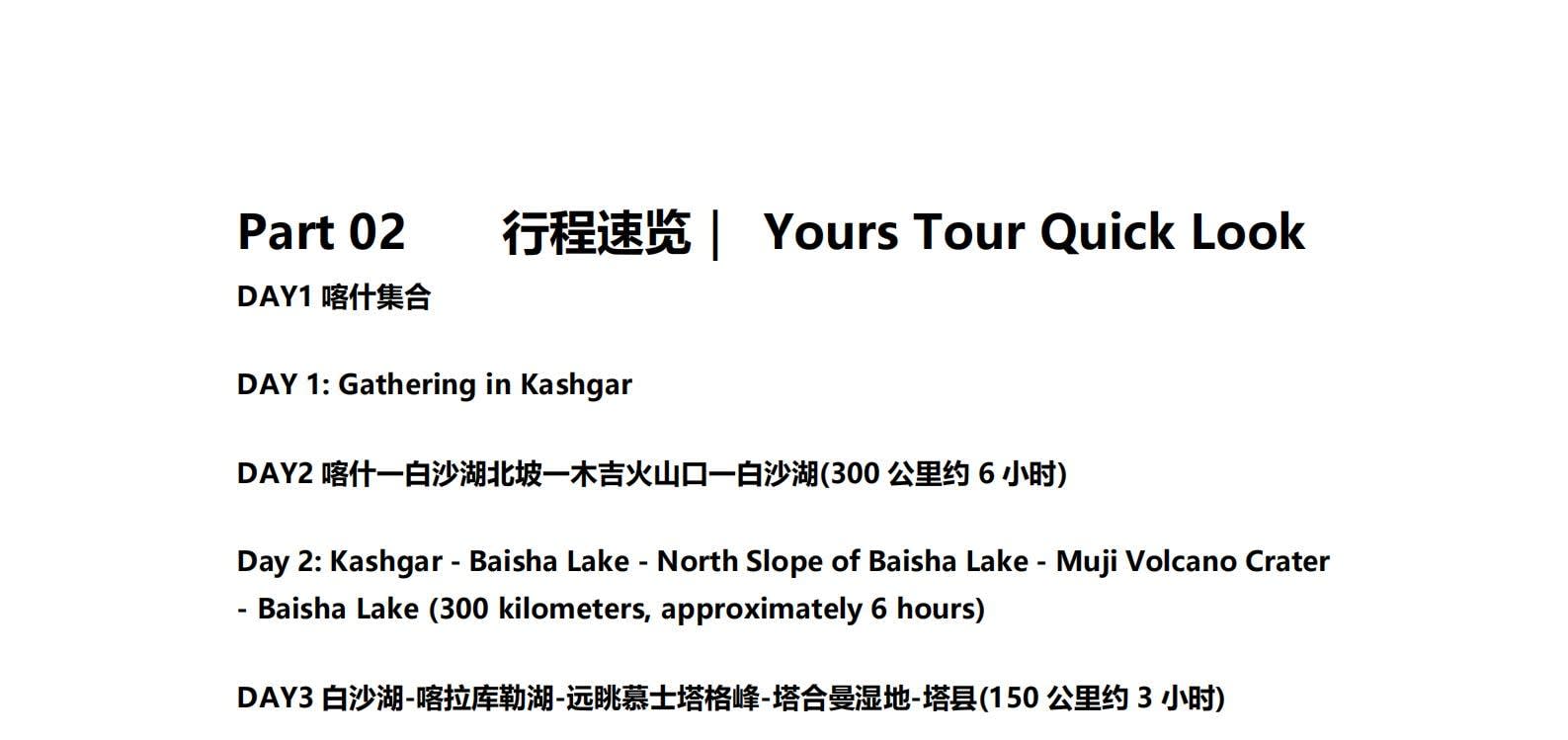 1일차: 카슈가르 집결 2일차: 카슈가르 - 바이샤 호수 - 바이샤 호수 북쪽 경사면 - 무지 화산 분화구 - 바이샤 호수 3일차: 바이샤 호수 - 칼쿨 호수 - 무즈타그 산 조망 - 타차만 습지 - 타촨현 4일차: 타이현 - 판룽 고대 도로 - 반디에르 블루 호수 - 행복 5호 다리 - 타이르향 - 싱화촌 (개화 시기: 3월 중순~하순, 4월 초) 5일차: 탈라향 - 싱화대로 - 다싱향 - 샤오딩향 - 티아현 6일차: 타야현 - 무즈타그 빙하 공원 - 카슈가르 7일차: 카슈가르 개막식 - 금메달 설명 - 고대 도시 시티워크 - 카슈가르 자유 투어