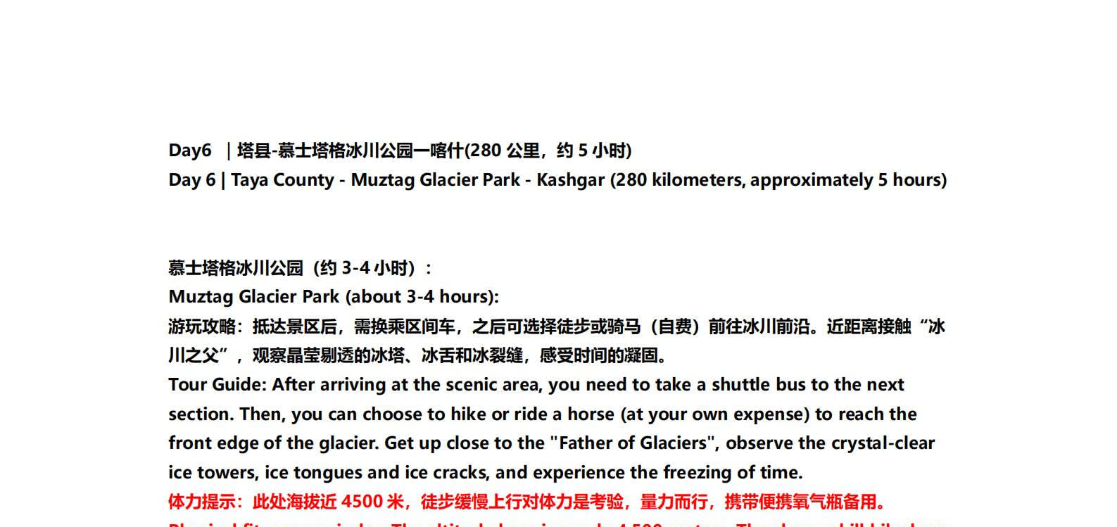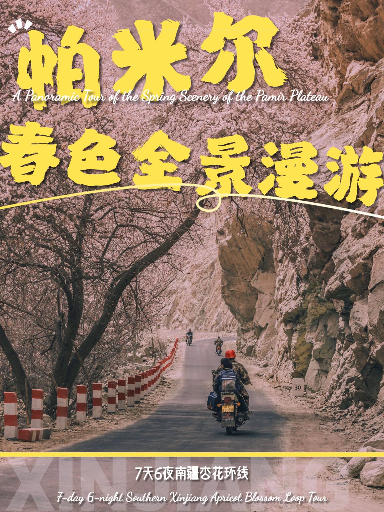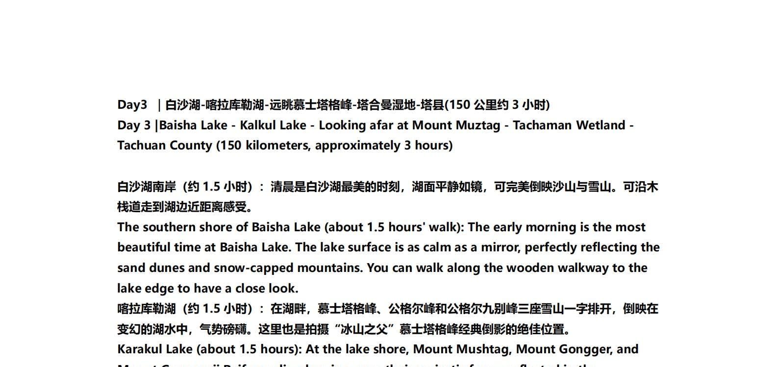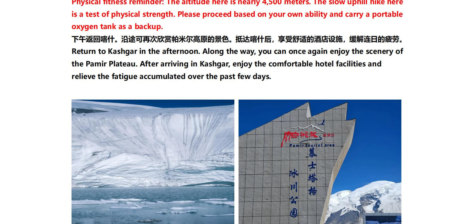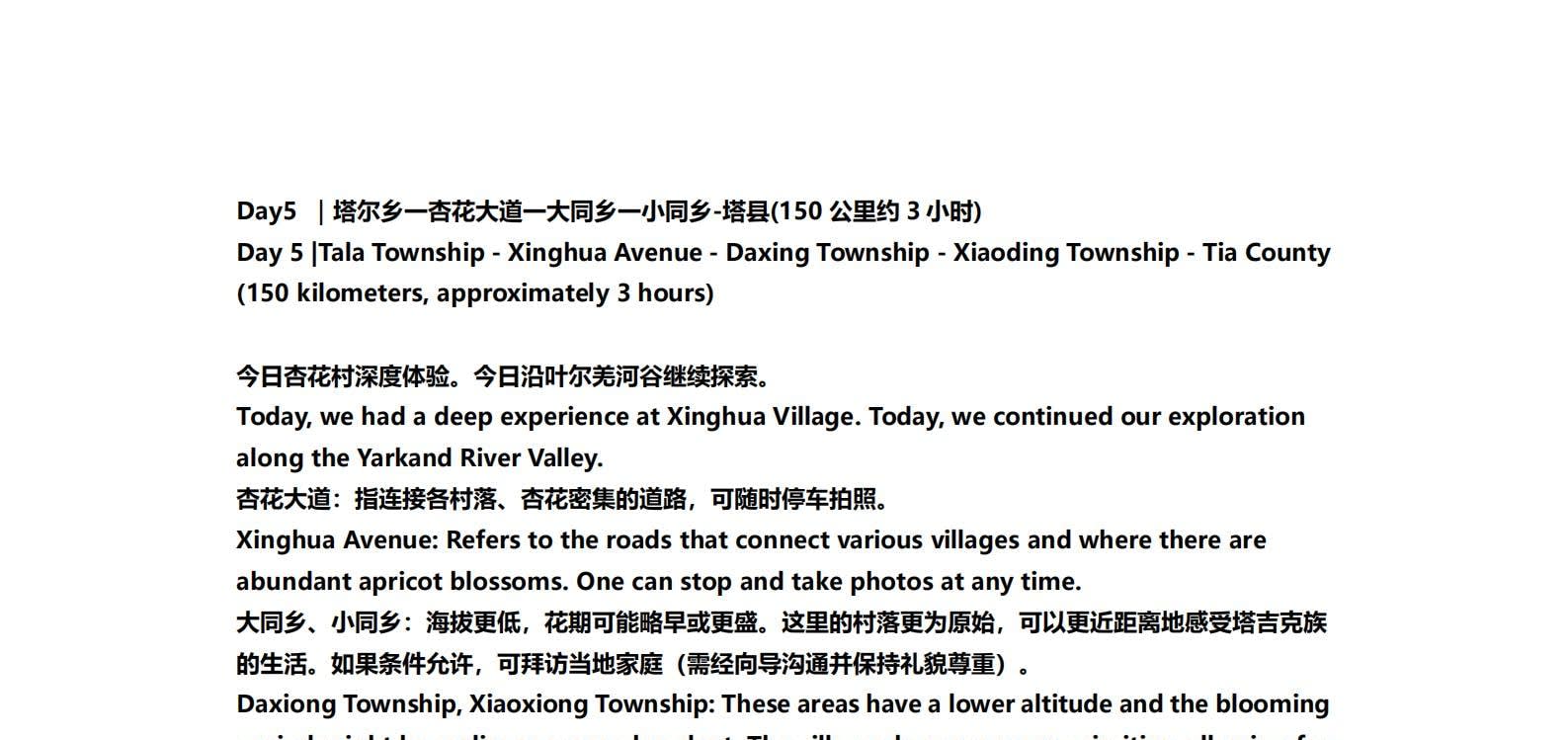 1일차: 카슈가르 집결 2일차: 카슈가르 - 바이샤 호수 - 바이샤 호수 북쪽 경사면 - 무지 화산 분화구 - 바이샤 호수 3일차: 바이샤 호수 - 칼쿨 호수 - 무즈타그 산 조망 - 타차만 습지 - 타촨현 4일차: 타이현 - 판룽 고대 도로 - 반디에르 블루 호수 - 행복 5호 다리 - 타이르향 - 싱화촌 (개화 시기: 3월 중순~하순, 4월 초) 5일차: 탈라향 - 싱화대로 - 다싱향 - 샤오딩향 - 티아현 6일차: 타야현 - 무즈타그 빙하 공원 - 카슈가르 7일차: 카슈가르 개막식 - 금메달 설명 - 고대 도시 시티워크 - 카슈가르 자유 투어