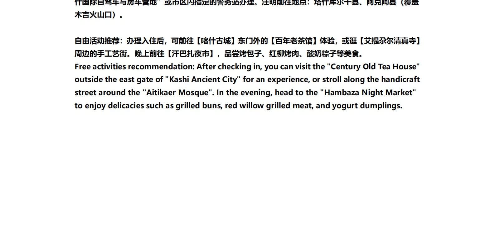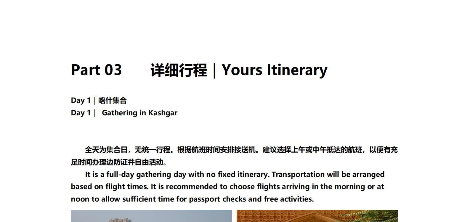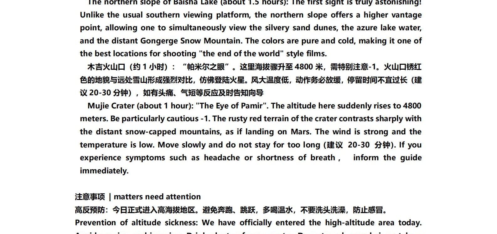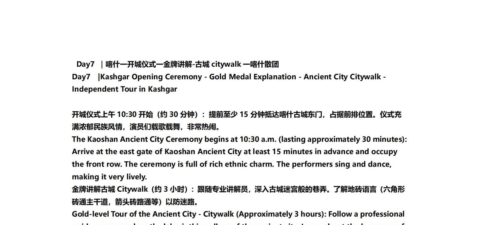 1일차: 카슈가르 집결 2일차: 카슈가르 - 바이샤 호수 - 바이샤 호수 북쪽 경사면 - 무지 화산 분화구 - 바이샤 호수 3일차: 바이샤 호수 - 칼쿨 호수 - 무즈타그 산 조망 - 타차만 습지 - 타촨현 4일차: 타이현 - 판룽 고대 도로 - 반디에르 블루 호수 - 행복 5호 다리 - 타이르향 - 싱화촌 (개화 시기: 3월 중순~하순, 4월 초) 5일차: 탈라향 - 싱화대로 - 다싱향 - 샤오딩향 - 티아현 6일차: 타야현 - 무즈타그 빙하 공원 - 카슈가르 7일차: 카슈가르 개막식 - 금메달 설명 - 고대 도시 시티워크 - 카슈가르 자유 투어
