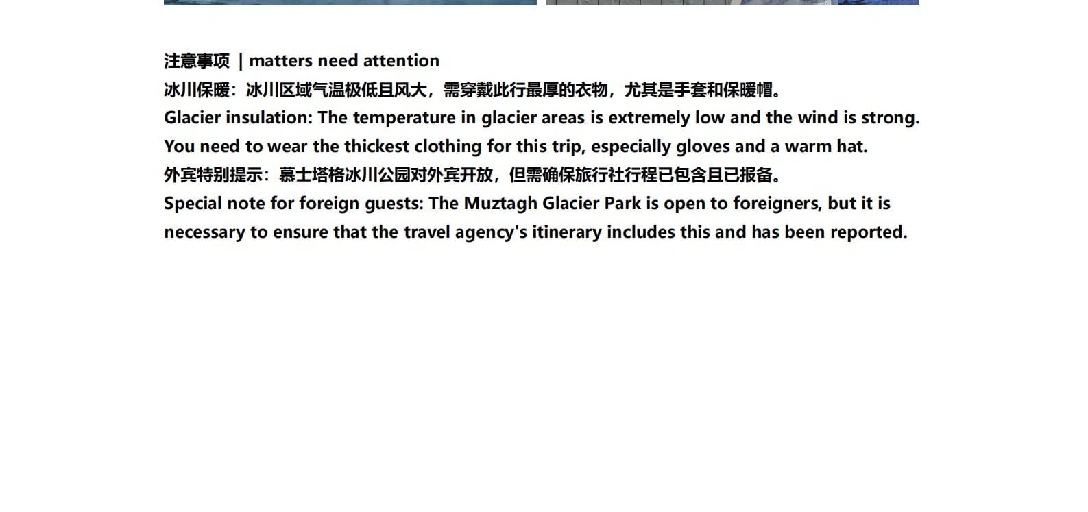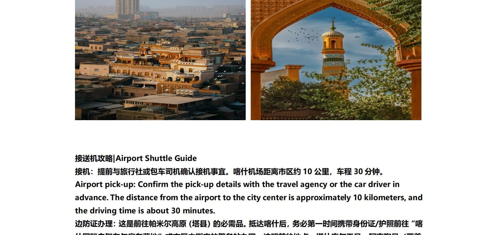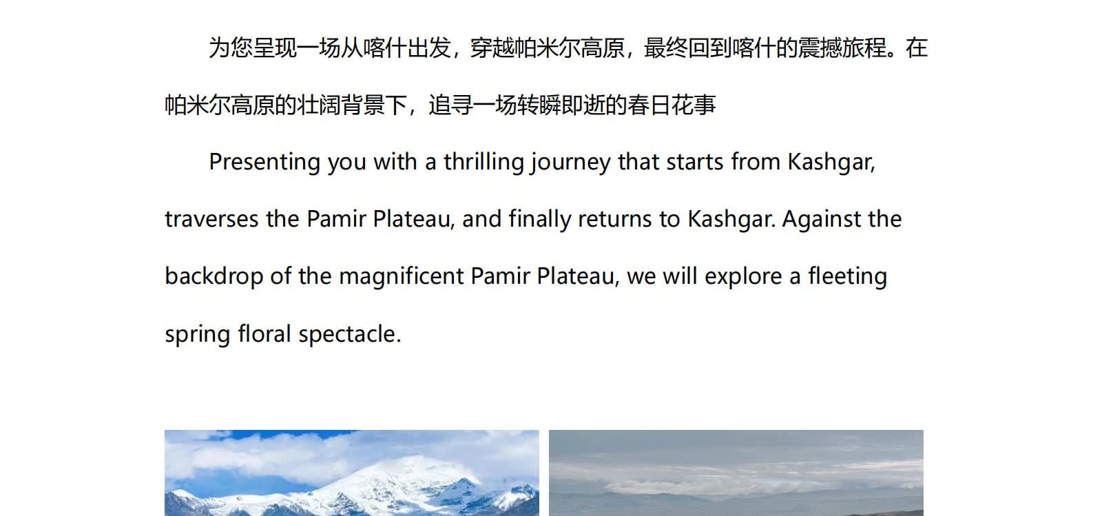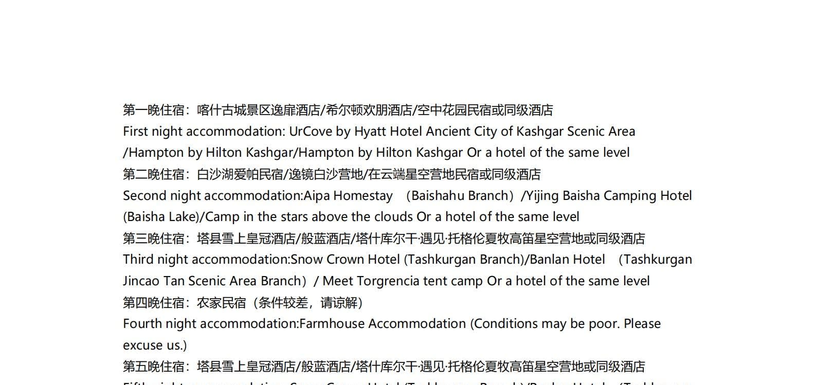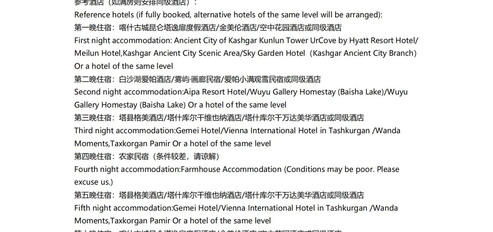 1일차: 카슈가르 집결 2일차: 카슈가르 - 바이샤 호수 - 바이샤 호수 북쪽 경사면 - 무지 화산 분화구 - 바이샤 호수 3일차: 바이샤 호수 - 칼쿨 호수 - 무즈타그 산 조망 - 타차만 습지 - 타촨현 4일차: 타이현 - 판룽 고대 도로 - 반디에르 블루 호수 - 행복 5호 다리 - 타이르향 - 싱화촌 (개화 시기: 3월 중순~하순, 4월 초) 5일차: 탈라향 - 싱화대로 - 다싱향 - 샤오딩향 - 티아현 6일차: 타야현 - 무즈타그 빙하 공원 - 카슈가르 7일차: 카슈가르 개막식 - 금메달 설명 - 고대 도시 시티워크 - 카슈가르 자유 투어