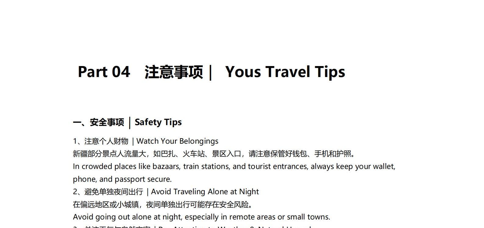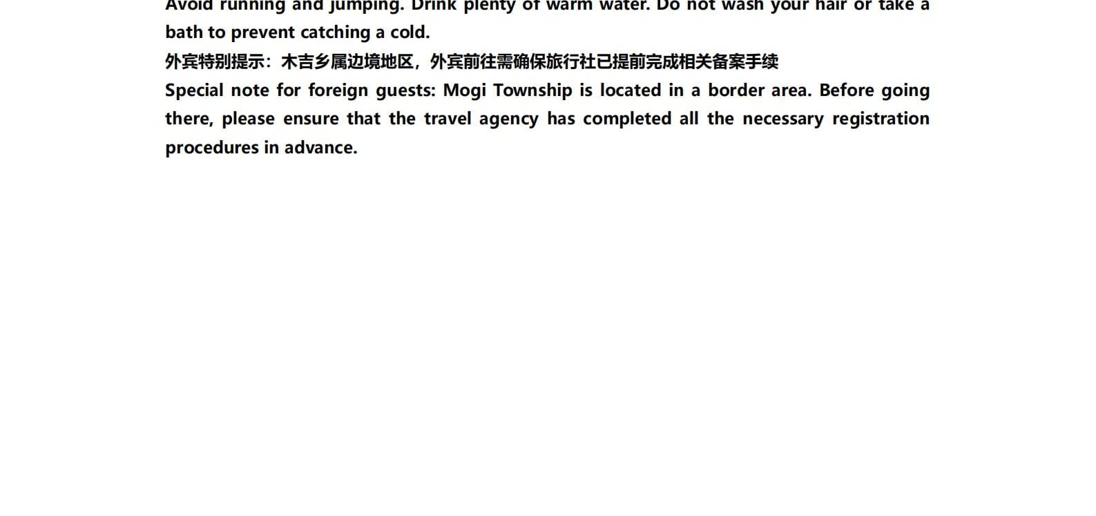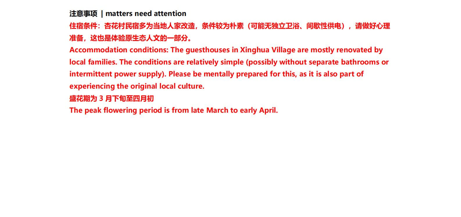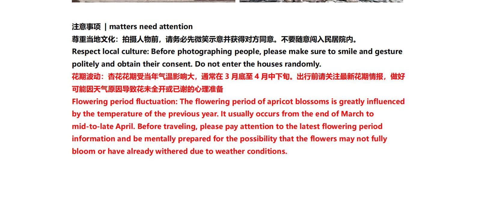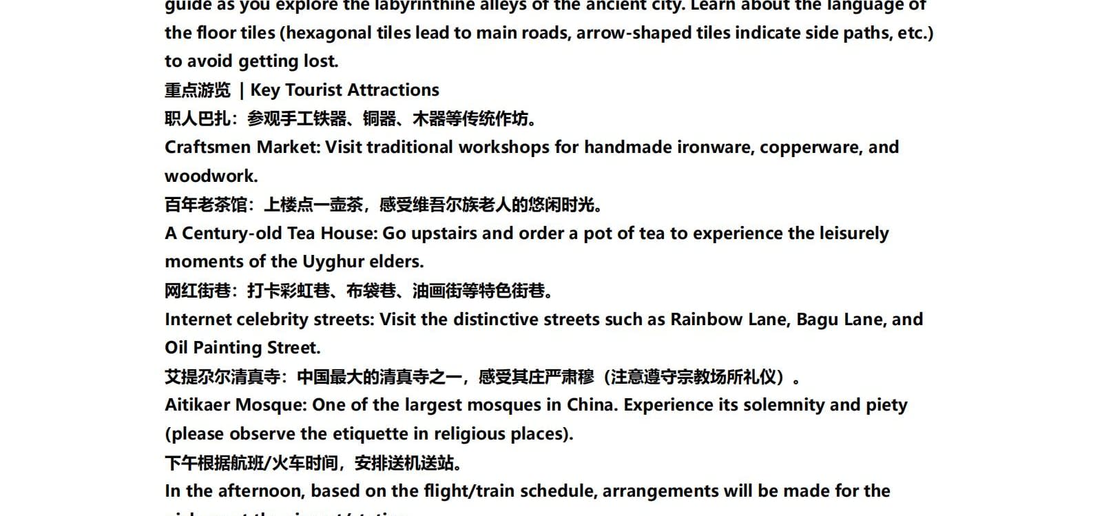 1일차: 카슈가르 집결 2일차: 카슈가르 - 바이샤 호수 - 바이샤 호수 북쪽 경사면 - 무지 화산 분화구 - 바이샤 호수 3일차: 바이샤 호수 - 칼쿨 호수 - 무즈타그 산 조망 - 타차만 습지 - 타촨현 4일차: 타이현 - 판룽 고대 도로 - 반디에르 블루 호수 - 행복 5호 다리 - 타이르향 - 싱화촌 (개화 시기: 3월 중순~하순, 4월 초) 5일차: 탈라향 - 싱화대로 - 다싱향 - 샤오딩향 - 티아현 6일차: 타야현 - 무즈타그 빙하 공원 - 카슈가르 7일차: 카슈가르 개막식 - 금메달 설명 - 고대 도시 시티워크 - 카슈가르 자유 투어