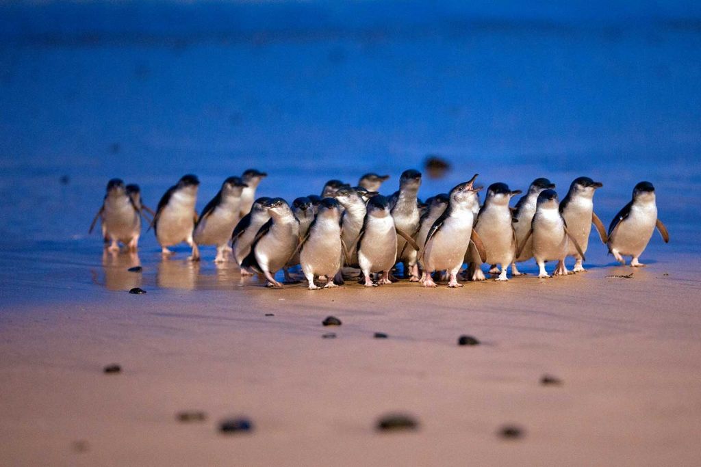 저녁부터 밤까지 카우스(Cowes) 마을과 노비스 곶(The Nobbies)을 지나 마지막으로 필립 아일랜드(Philip Island)의 하이라이트인 세계적으로 유명한 펭귄 퍼레이드(Penguin Parade)에 도착합니다. 날이 어두워지면 꼬마펭귄들이 바다에서 뭍으로 돌아와 둥지로 돌아가 휴식을 취하며 독특하고 귀중한 자연 생태 경관을 형성합니다. 여행객은 현장 규정에 따라 펭귄 귀환 과정을 관람하며 관련 보호 규정을 준수하여 야생 동물 생태계를 함께 보호해야 합니다.