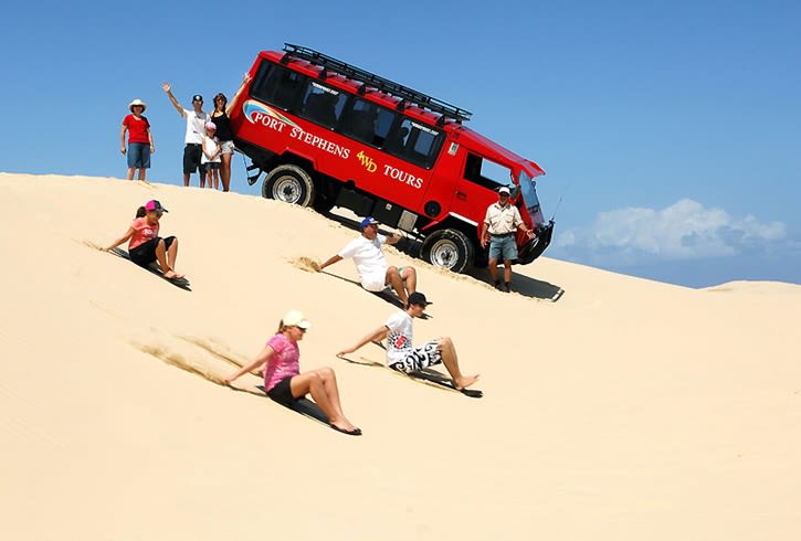 해양 액티비티의 즐거움: 포트스테판에서 야생 돌고래를 찾아 떠나는 크루즈와 사막 모래 언덕에서의 짜릿한 샌드보딩을 체험합니다.