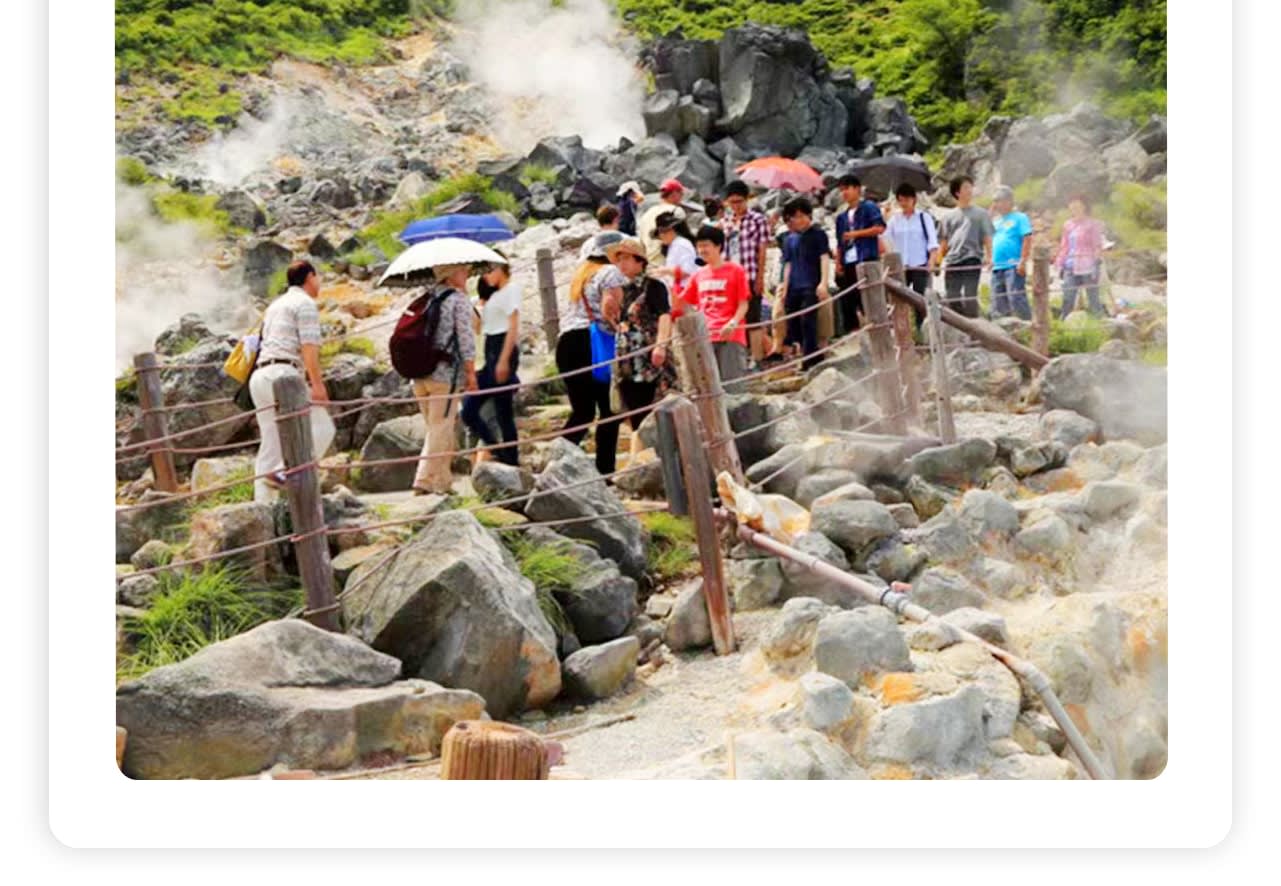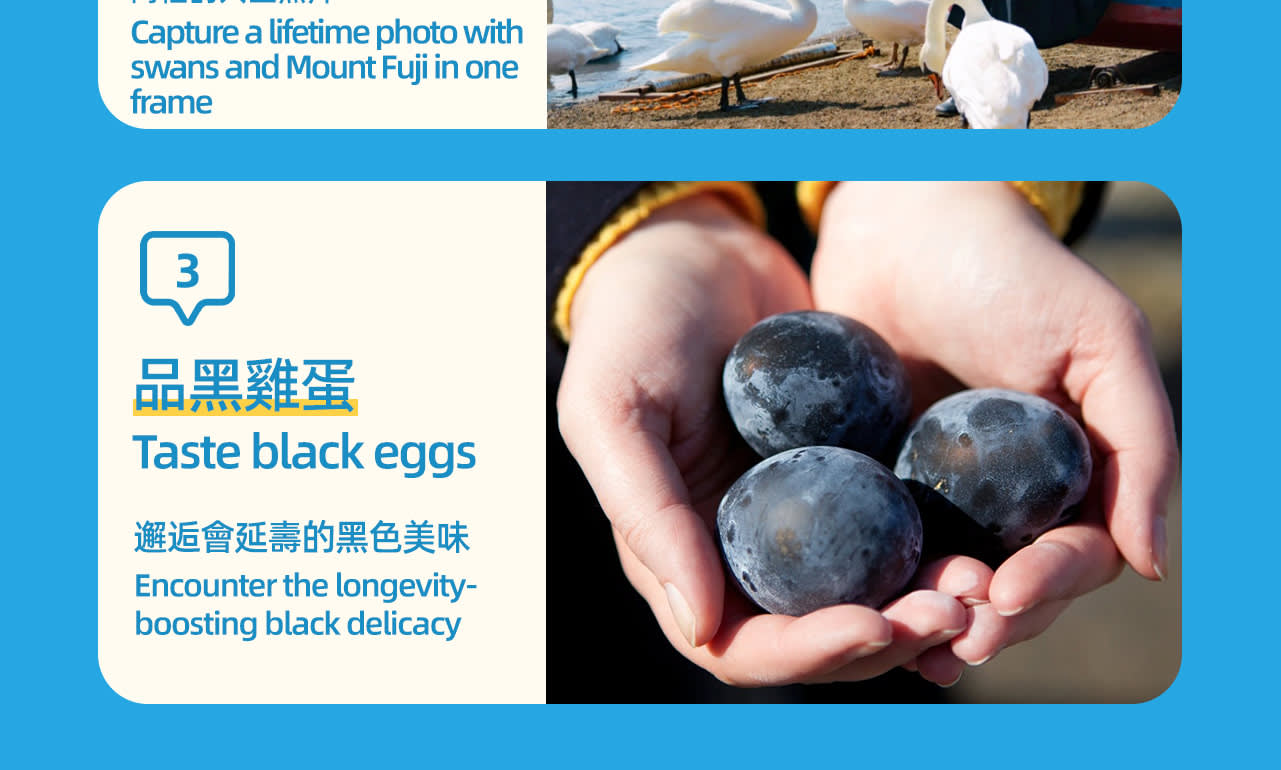 * 네 번째 장소: 🌋오와쿠다니는 하코네의 유명한 관광 명소이며 이곳에는 명물 간식인 🐣검은 계란도 있습니다. "한 개 먹으면 7년 수명이 늘어난다"고 합니다.
