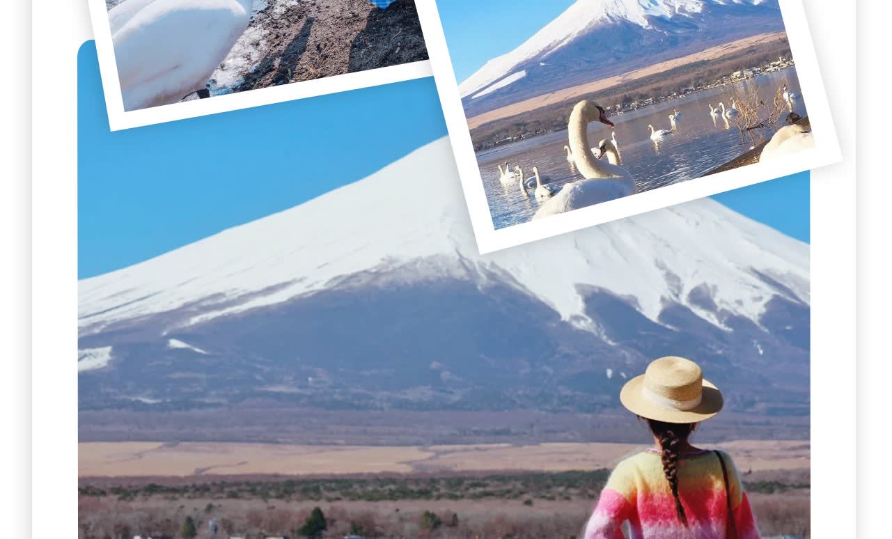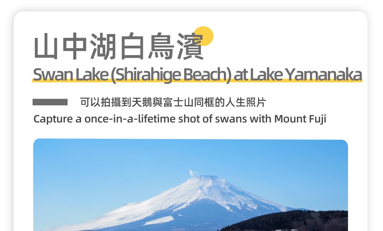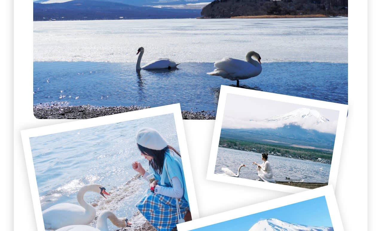 * 다섯 번째 장소: 🦢야마나카코 백조 해변: 야마나카코 호숫가에는 많은 백조가 서식하고 있으며, 이곳에서 도시의 소음에서 벗어나 동물과 자연의 조화로운 공존을 조용히 느낄 수 있습니다.
