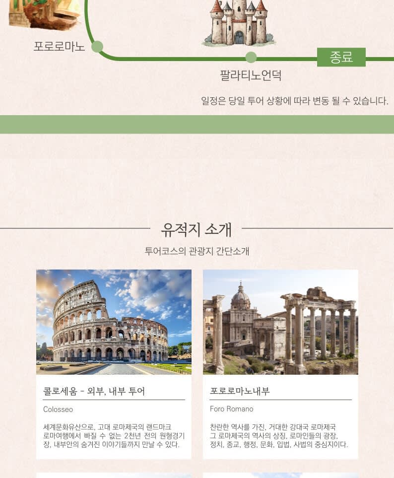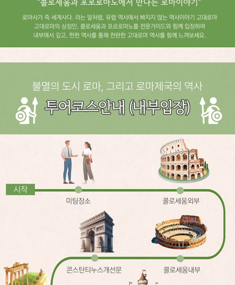 👉 오후 투어 시간: 동절기 13:00 ~ 13:30 / 하절기 14:00 ~ 14:30 (티켓 시간에 맞춰 전날 미팅 시간 안내드립니다.) 👉 미팅 장소: 콜로세오역 1층 지하철 출구 앞 👉 투어 코스 미팅 포인트 → 콜로세움 내부 → 콘스탄티누스 개선문 → 포로 로마노 내부 (티투스 개선문 – 베스타 신전 – 세베로 개선문 – 팔라티노 – 안토니우스 피우스 신전 – 시저 화장터 등)