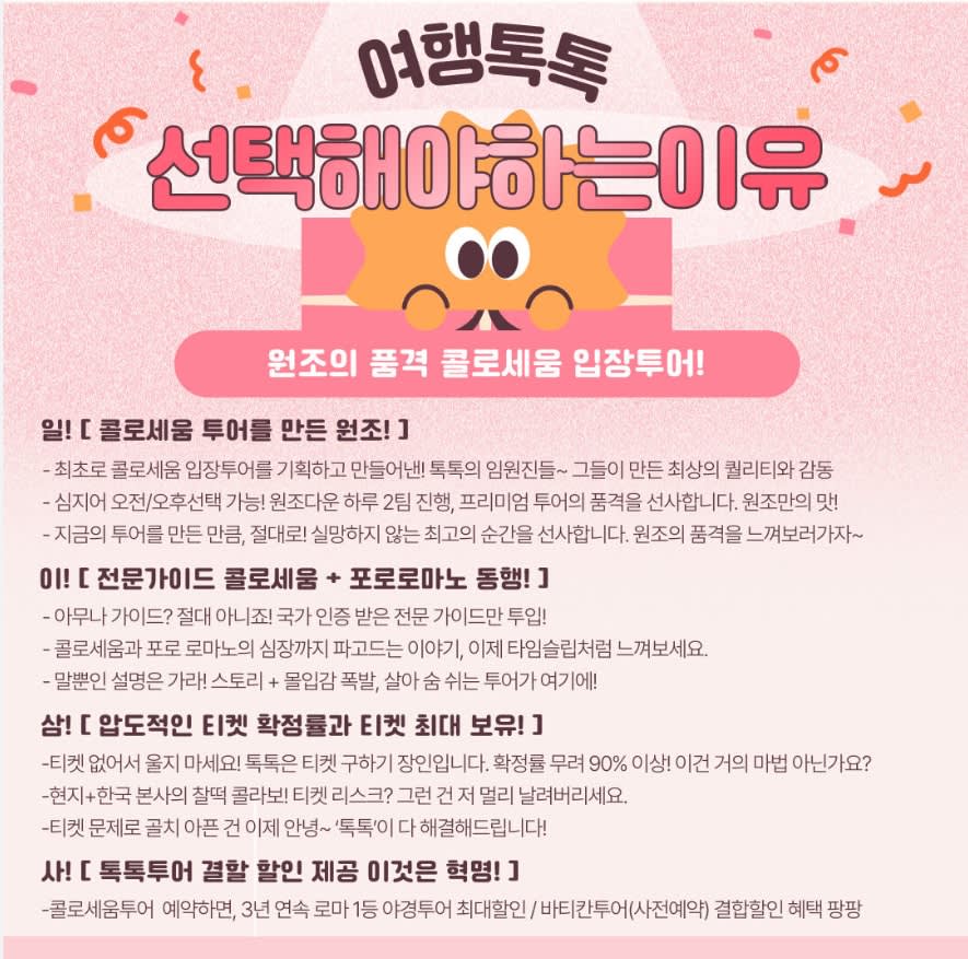 ✅포함 사항 * 여행톡톡 가이드 비용 ❌ 불포함 사항 * 정규 티켓 기준 -> 콜로세움·포로로마노·팔라티노 입장권: 성인 18유로 / 학생 2유로/ 수신기 비용: 1인 3유로 * 패스트트랙 티켓 기준 -> 입장권: 성인 28유로 / 학생 2유로 / 수신기 비용: 1인 3유로 * 예약 후 구매 가능한 티켓 종류에 따라 불포함 사항이 달라집니다. (예약 → 티켓 수배 → 금액 전달 → 입금 확인 → 예약완료 순으로 확정됩니다.) * 티켓은 가이드가 사전 예약하며, 상세 내용은 메세지를 통해 문의바랍니다. 💙 이용 안내 * 오전 투어: 08:30 ~ 09:00 * 오후 투어: 14:00 ~ 14:30 * 현지 상황에 따라 입장 순서는 변경될 수 있습니다. * 미팅 장소: B선 콜로세오역 1층 출구 (Piazza del Colosseo, 00184 Roma RM) * 정확한 미팅 시간과 장소는 전날 카카오톡으로 안내드립니다. ❤️ 티켓 및 실명제 안내 * 본 투어는 FAST TRACK(패스트트랙) 기준으로 운영됩니다. * 입장료: 성인 28유로/학생 5유로/수신기 사용료 1인 3유로 * 학생 할인은 만 17세 이하만 적용되며,여권 지참이 필수입니다. * 실명제 도입으로 예약 시 여권상 영문성함과 생년월일을 정확히 기재해야 합니다.(오·기재 시 입장 제한 가능, 학생도 동일하게 기재 필요) * 콜로세움은 입장 후 75분 관람 제한이 있습니다. * 사전 예약 티켓은 취소 및 환불 불가 ❤️기타 안내 * 단체 투어 특성상 지각 시 참여 불가, 정시에 출발합니다. * 개인용 3.5mm 유선 이어폰을 지참해주세요. (없을 시 무료 대여 가능/ 5인이상시 수신기 비용 3유로 발생) * 현지 사정(기상, 오픈 지연 등)에 따라 코스 및 시간 변경이 있을 수 있습니다. * 우천 시에도 투어는 정상 진행됩니다. * 개인 소지품은 본인 책임하에 보관해주세요. (소매치기 주의) * 여권 등 신분증 필수 지참, 미소지 시 입장 제한 가능 * 최소 모객 인원 미달 시 투어가 취소될 수 있습니다. * 투어시간은 약 3시간~3시간30분 소요되며, 현지 상황에 따라 변동 될수있습니다. 또한 상황에 따라 협력 업체와 공동으로 진행하는 투어에 참가하실 수도 있습니다. * 여행자 보험에 가입하고 투어에 참여할것을 권장합니다. 🔒 취소/환불 규정 * 여행일 기준 1일 전 오전 9시 이전 통보 시: 여행 요금 100% 전액 환불 * 여행일 기준 1일 전 오전 9시 이후 통보 시: 취소/환불 불가 * 취소 요청 날짜와 시간은 여행 상품이 진행되는 현지 시간을 따릅니다.