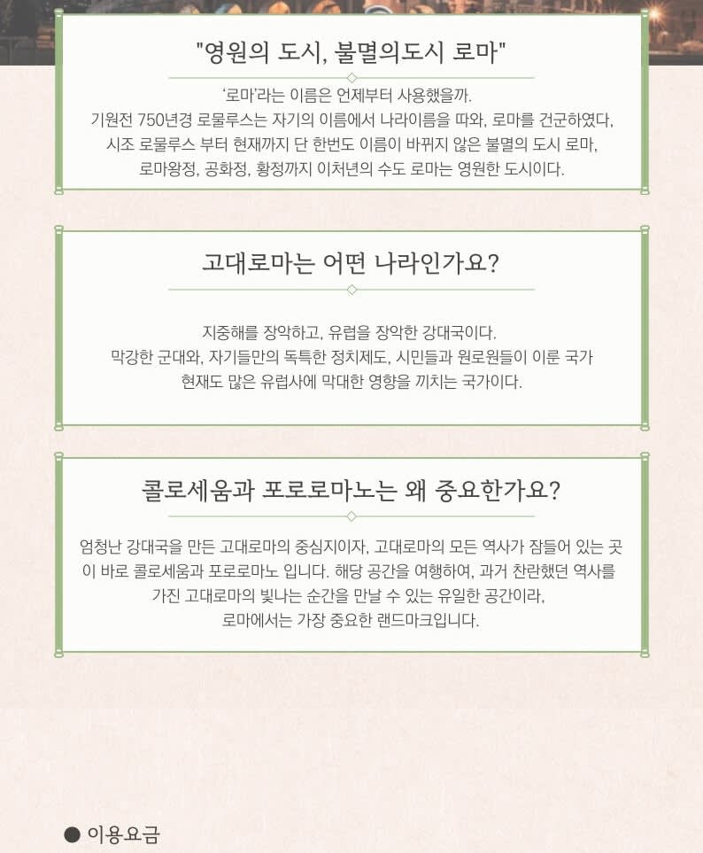 ▶오후 투어 - 이용요건 * 공지: 영유아 및 아동도 탑승객 인원수에 포함되어야 합니다. - 추가정보 * 필수 사항은 아니나, 본 액티비티 참여 전 상해 또는 여행 보험 가입을 권장합니다. - 준비물 * 개인이 필요한 비상약은 항상 개별적으로 챙겨서 다녀주시기 바랍니다. * 개인이어폰을 투어시 지참해주시기 바랍니다. (수신기사용시 필요) * 콜로세움 학생할인(무료) 적용자는 만 17세 미만 입니다. 투어당일 나이증명과 본인 확인이 가능한 여권이 필수지참 입니다