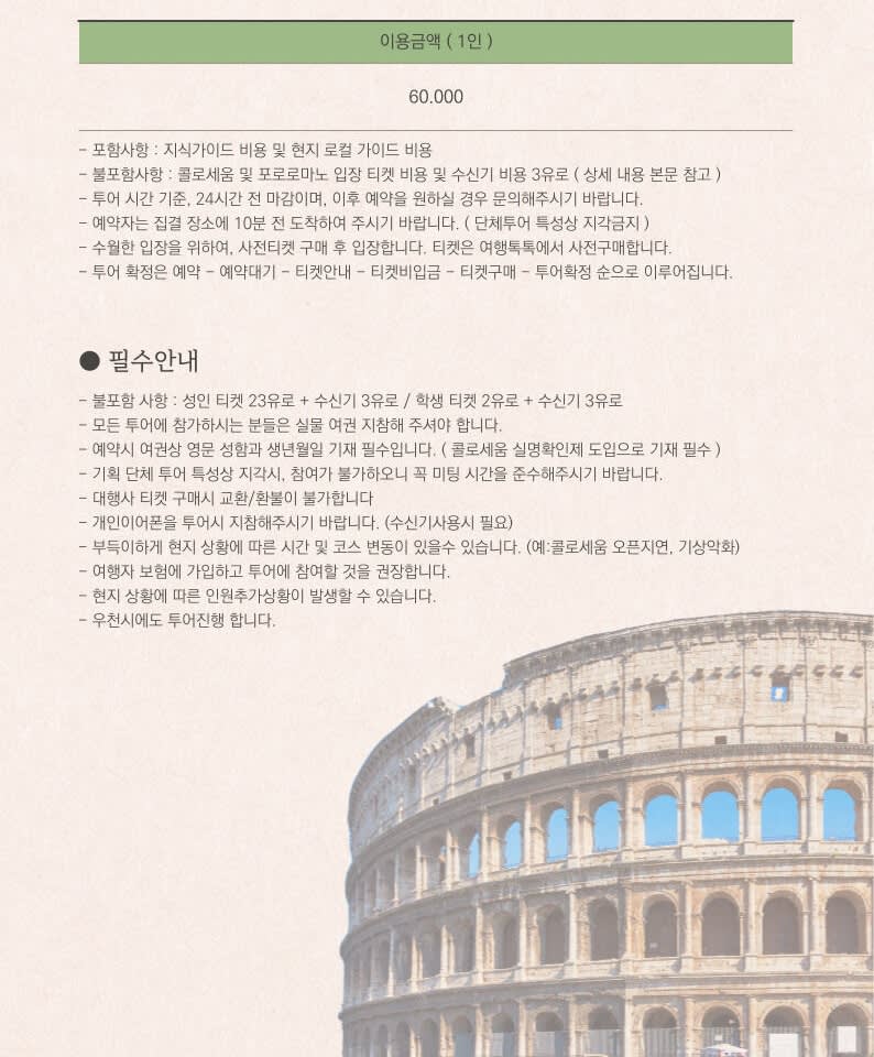 ▶오전 투어 - 이용요건 * 공지: 영유아 및 아동도 탑승객 인원수에 포함되어야 합니다. - 추가정보 * 필수 사항은 아니나, 본 액티비티 참여 전 상해 또는 여행 보험 가입을 권장합니다. - 준비물 * 개인이 필요한 비상약은 항상 개별적으로 챙겨서 다녀주시기 바랍니다. * 개인이어폰을 투어시 지참해주시기 바랍니다. (수신기사용시 필요) * 콜로세움 학생할인(무료) 적용자는 만 17세 미만 입니다. 투어당일 나이증명과 본인 확인이 가능한 여권이 필수지참 입니다
