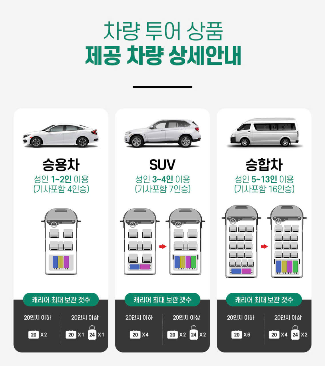* 예약인원별 차량제공안내, 성인 1-2인 승용차 / 3-4인은 SUV 차량 제공 / 성인 5-13인은 승합차 제공