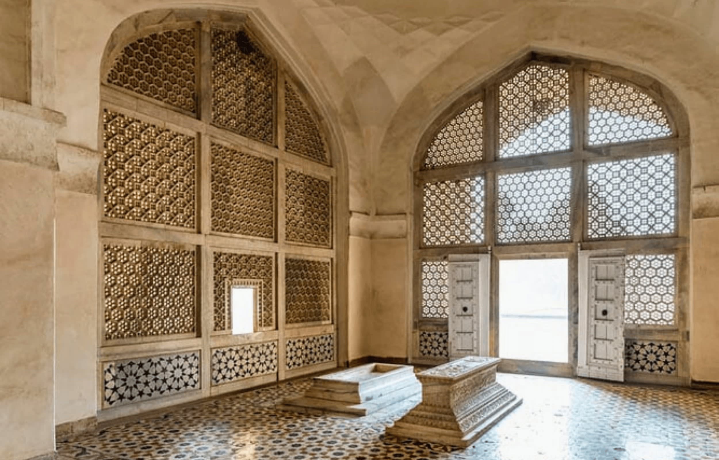 웅장한 입구와 조경된 길을 따라 걸으면서 아름답게 조각된 벽, 복잡한 기하학적 패턴, 서예를 감상해 보세요. 묘의 건축 양식은 종교적 조화와 지적 깊이에 대한 악바르의 비전을 반영합니다.