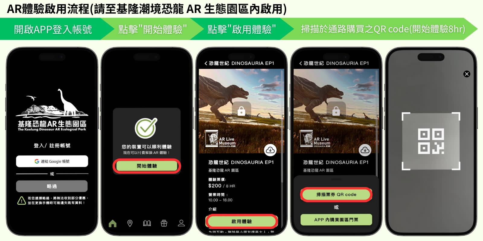 (앱 다운로드 필요: Keelung Dinosaur AR) 본 원내에는 10개의 선사 시대 AR 생태 탐사 구역이 있으며, 백악기, 쥐라기의 공룡 생태가 서식하고 있습니다. 이 고대 생물들은 1억 3천만 년의 시간을 거슬러 기륭에서 다시 살아납니다! 공원 투어 중 숲 속에서 티라노사우루스와 눈을 마주치거나 해안가에서 먹이를 먹는 브라키오사우루스 가족을 만날 기회가 있을 수 있으며, 트리케라톱스의 영역 다툼을 보거나 다른 생물의 흔적을 발견할 수도 있습니다. ![1200 (4)] 휴대폰, 태블릿으로 AR 실감 나는 탐험 체험을 시작하여 공룡의 생활 습성을 가까이에서 관찰하고 연구하며 이전에는 경험하지 못했던 탐험의 즐거움을 느낄 수 있습니다! AR 실감 기술을 통해 디지털과 현실을 매끄럽게 융합하여 새로운 시각으로 주변 환경을 재탐색할 수 있습니다. 휴대폰, 태블릿과 같은 다양한 장치 특성을 활용하여 공간에 대한 기존의 상상을 뛰어넘어 미래와 과거가 교차하는 고대 세계로 함께 들어가 보세요!