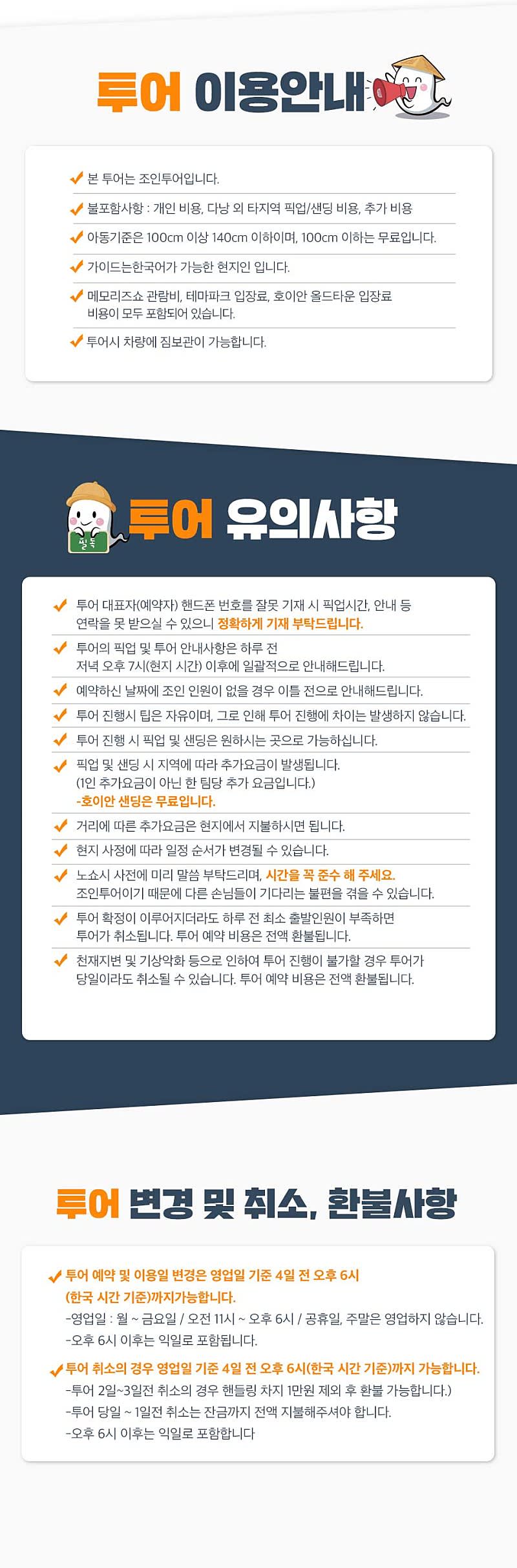 ✅[예약 확정 이후 파트너에게 남겨주세요.] ---------투어 신청양식--------- 투어명: 날짜: 이름: 전화번호: 성인 인원: 아동 인원: 픽업 장소: 드랍 장소: ------------------------------- 📌[안내 사항] - 본 투어는 조인 투어입니다. - 불포함 사항 : 기타비용, 다낭 외 타 지역 픽업/샌딩 비용, 추가비용 - 아동은 100cm 이상 ~ 140cm 이하, 100cm 미만은 무료입니다. - 가이드는 한국어가 가능한 현지인 입니다. - 메모리즈쇼 관람비, 테마파크 입장료, 호이안 올드타운 입장료 비용이 모두 포함되어 있습니다. - 투어 대표자 (예약자) 번호를 잘못 기재 시 픽업시간, 안내 등 연락을 못 받을 수 있으니 정확한 기재 부탁드립니다. - 투어의 픽업 및 투어 안내사항은 하루 전 배차가 완료되어, 하루 전 저녁 오후 7시(현지 시각 기준) 에 연락 드립니다. - 예약하신 날짜에 조인인원이 없을 경우 3일 전 안내드립니다. - 최소 출발 인원은 6명입니다. - 현지 사정에 따라 일정 순서가 변경될 수 있습니다. - 투어 진행에 있어 노쇼시 사전에 미리 말씀 부탁 드리며 시간을 꼭 준수해 주시기 바랍니다. ※ 조인 투어로 다른 손님들이 기다리는 불편을 겪을 수 있습니다. 🚗픽업 / 샌딩안내 - 다낭지역 픽업&샌딩 기준 요금입니다. - 타지역(호이안,남호이안,인터컨등등)은 추가금이 발생됩니다. ◾ 픽업 및 샌딩 시 지역에 따라 추가요금이 발생합니다. (1인 추가요금이 아닌 팀당 추가요금) - 호이안, 인터컨티넨탈 편도 / 왕복 무관 $10 추가됩니다. - 남호이안, 랑코 편도 $15 / 왕복 $30 추가 됩니다. - 후에 편도 $25 / 왕복 $50 추가됩니다. *개인의 부주의 등으로 인한 사고의 경우 가이드가 도움을 드리기 어려울 수 있습니다. *해외 여행 중 발생할 수 있는 만일의 사고를 대비하여 개인 여행자 보험 가입을 가급적 권장합니다. *최소 모객인원 미만 모객 시 투어가 취소될 수 있습니다. *투어 시 소지품을 분실하는 경우 되찾는 것이 어려우니 주의해주세요. *픽업 시간에 지각하시거나 나타나지 않으실 경우 투어 이용이 어려울 수 있습니다.