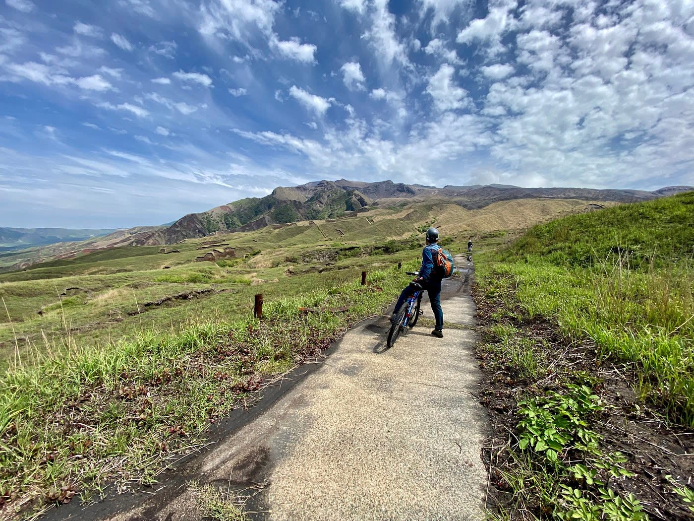 E-MTB(전동 어시스트 자전거)를 타고 아소 나카다케의 '천년 초원'을 둘러보세요 아소역(해발 약 500m)의 칼데라 바닥에서 출발하여 아소 나카다케 화구(해발 약 1,300m)까지 표고차 800m의 오르막 내리막 라이딩 코스입니다.