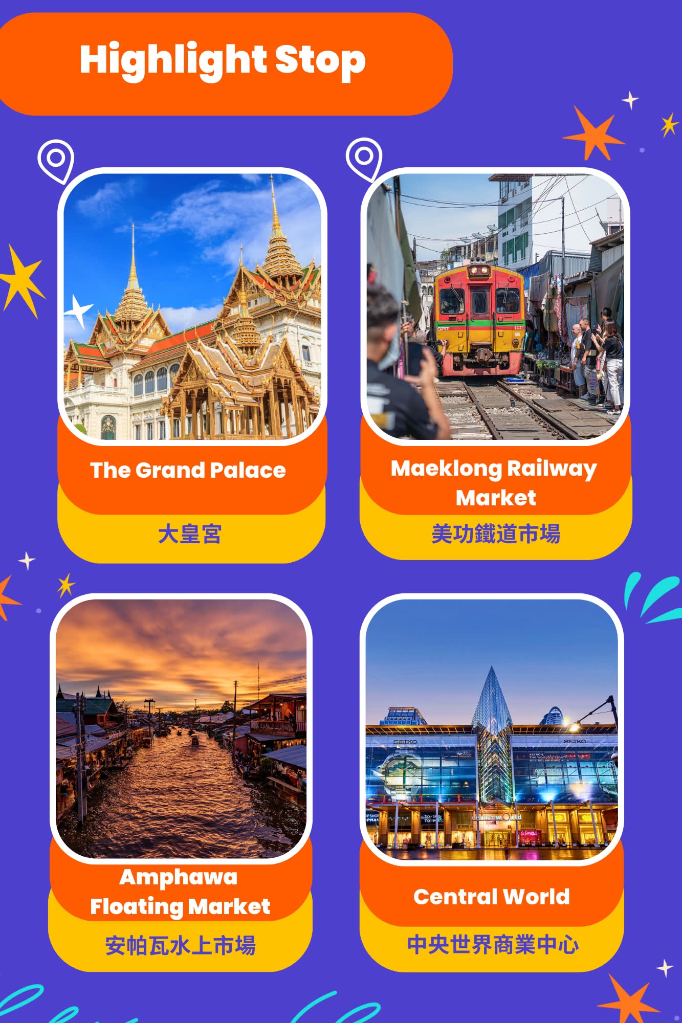 * 태국의 암파와 수상 시장을 방문하여 활기찬 분위기에 빠져들어 독특한 현지 제품을 쇼핑하고 맛있는 길거리 음식을 맛볼 수 있습니다.