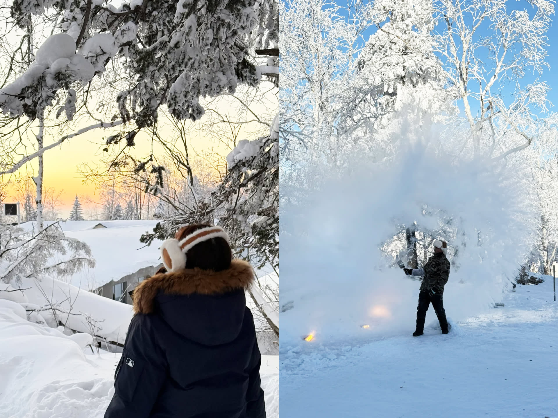 * 버스 그룹은 신설향/빙설화랑 풍경구의 고급 민박/농가에 숙박, 문을 나서면 바로 상고대 감상, 출발 시간 늦춰짐