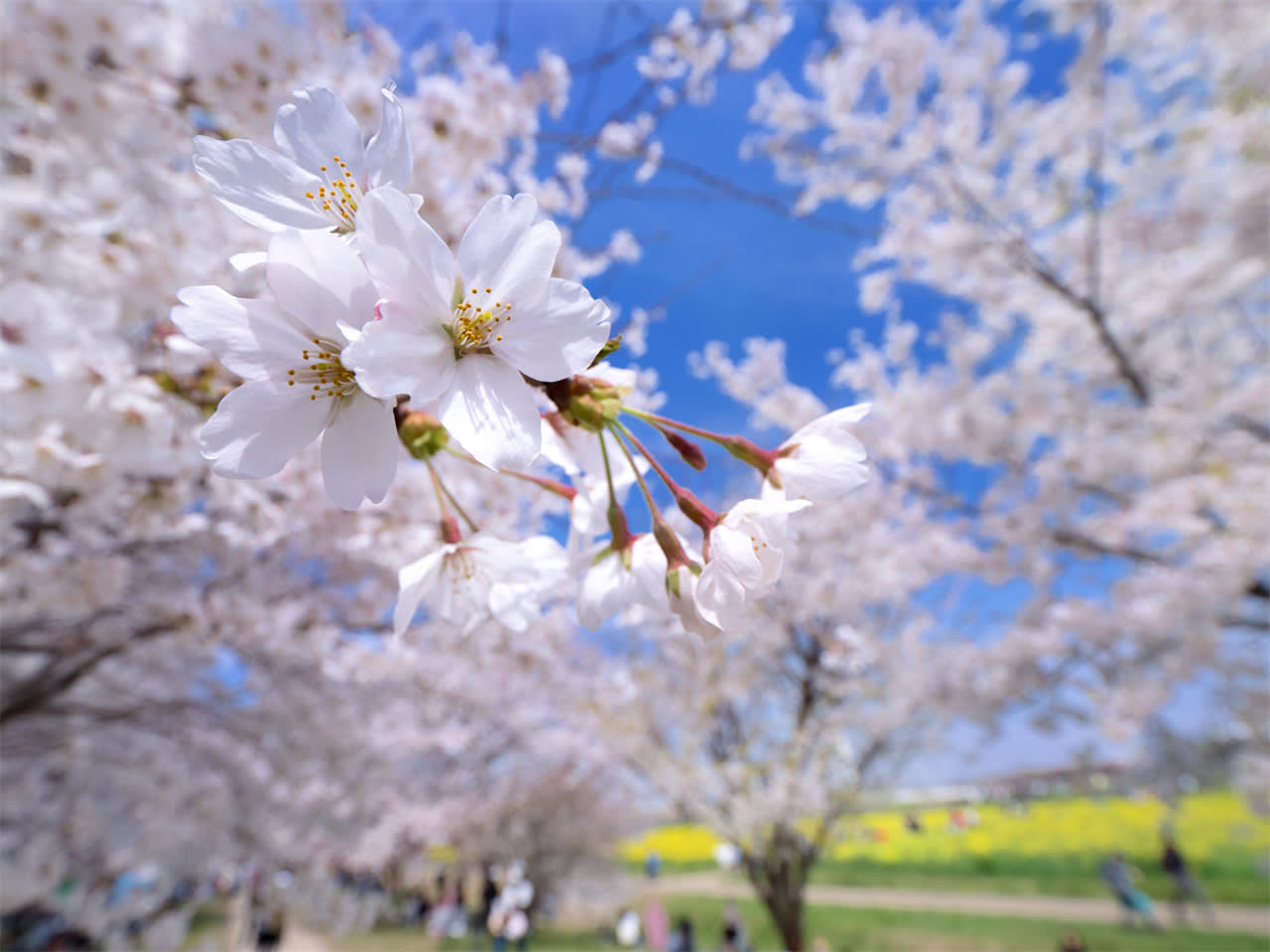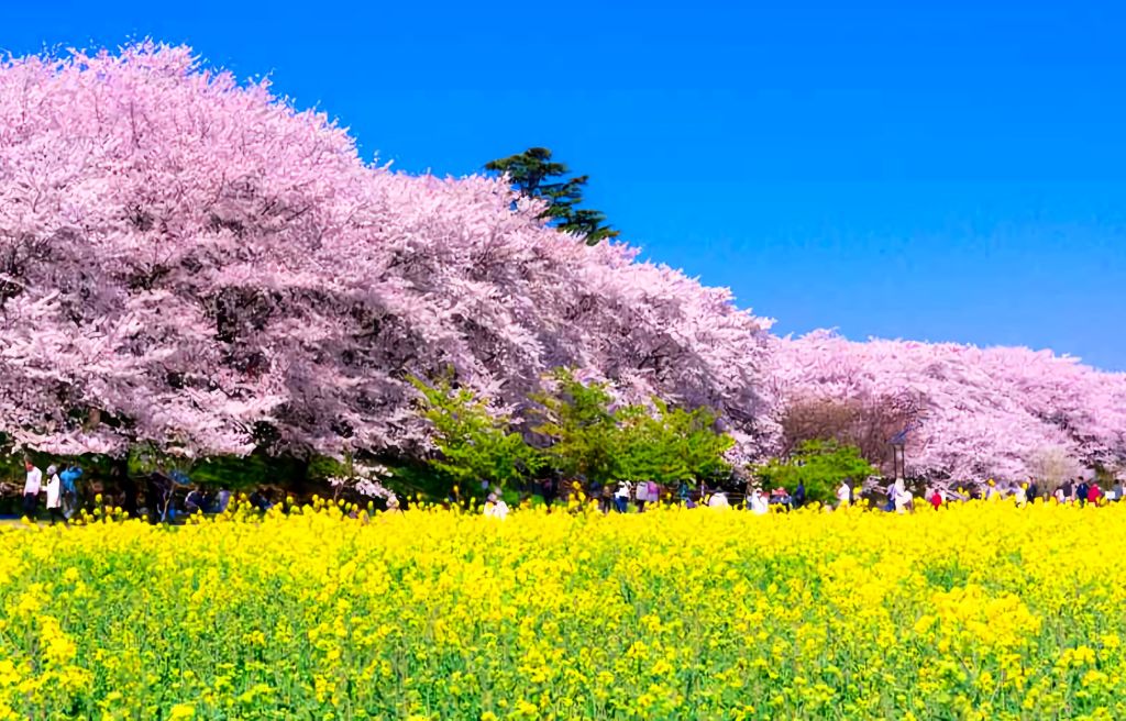 * 삿테 곤겐도 벚꽃 제방, 수천 그루의 벚꽃과 유채꽃이 어우러짐