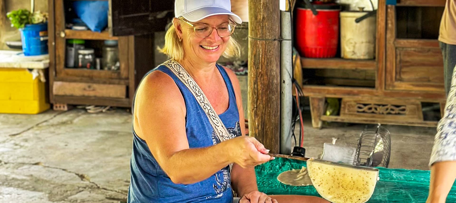 이어서 호이안의 등불 및 가죽 공방을 둘러봅니다. 호이안 고대도시가 보이는 강변 카페에서 잠시 휴식을 취한 후 아름다운 논밭을 지나 짜꿰 빌리지로 이동하여 현지인들과 함께 라이스 크래커를 만들어 볼 수 있습니다.