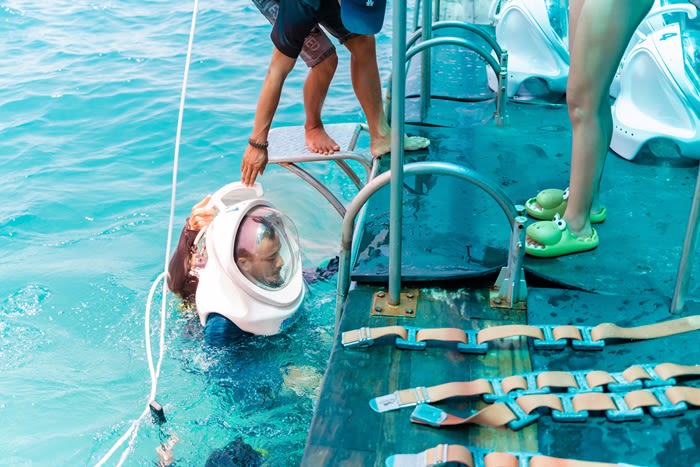 체험 다이빙이 부담스럽거나 수영을 못하시는 분들께 씨워킹을 추천합니다. 씨워킹 포인트는 체험 다이빙과 다른 곳에서 진행됩니다. 순서가 되면 특별한 헬멧을 쓰고 바닷속으로 입수! 마치 거대한 수족관 안에 들어온 것처럼 수많은 물고기들과 함께 걷는 신비로운 경험을 할 수 있어요. 인증샷도 놓치지 마세요!