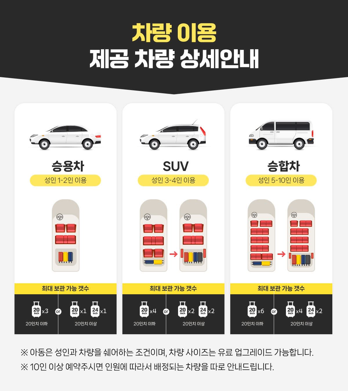 💡안내사항 1. 인원 규정 안내 성인 : 키 140cm이상 아동 : 키 100 ~ 139cm이하 유아 : 키 99cm이하 → 규정에 위반 되는 경우 환불 및 교환 불가하며, 현장에서 성인 티켓을 새로 구매하셔야 합니다. → 예약 전, 반드시 아동 키 확인후 규정에 맞춰 구매 및 접수해 주세요. 2. 다낭 지역 외 차량 추가 요금 안내 (편도/차량1대당) - 인터컨티넨탈 : 10만동 - 랑코지역 : 70만동 3. 차량 업그레이드 안내 (사전 요청 필수!) - 승용차 → SUV : 10만동 - 승용차 → 승합차 : 35만동 - SUV → 승합차 : 25만동 4. 차량 이용 추가 안내 (사전 요청 필수!) 차량 추가는 시간당으로 추가 가능합니다. 시간당 : 10만동 - 당일 추가 요청 시 기사님 스케줄에 따라 불가 할 수 있습니다. → 모든 추가 요금은 최종 차량 하차시, 차량 기사님에게 정산하시면됩니다. 5. 팁안내 차량기사님 매너팁 : 1팀당 10~15만동 → 의무는 아니지만, 이용에 만족하셨다면 수고하신 차량 기사님에게 팁을 받는 즐거움을 선사해주세요. 6. 짐보관 안내 - 짐은 차량 트렁크에 보관 가능합니다. (트렁크 외 차량 좌석 보관 불가) - 개인 귀중품은 개별 소지해주세요. 7. 기타 안내 우천시에도 투어는 정상적으로 진행됩니다. (단, 업체에서 투어 진행 불가 공지가 전달된 시점에 최대한 빠르게 연락 및 안내 드립니다.) 8. 여행자 보험 안내 안전하고 즐거운 여행을 위해, 여행 전 개별 해외 여행자 보험 가입을 꼭 권장드립니다. 본 상품을 운영하는 스테이앤모어 (주)트래블멤버스는 기획여행 보증보험에 가입되어 있으나, 이는 전체 여행자를 대상으로 한 기본 보장으로, 개별 사고나 질병에 대한 보상 범위가 낮습니다. 또한, 베트남 현지 보험(교통·의료 등)의 보장 범위는 매우 제한적이므로, 사고나 질병 발생 시 국내 치료나 긴급 의료 서비스에 대한 충분한 보장을 받기 어려울 수 있습니다. 예기치 못한 상황에 대비해, 개인 여행자 보험을 미리 준비하시어 더욱 안전한 여행이 되시길 바랍니다.