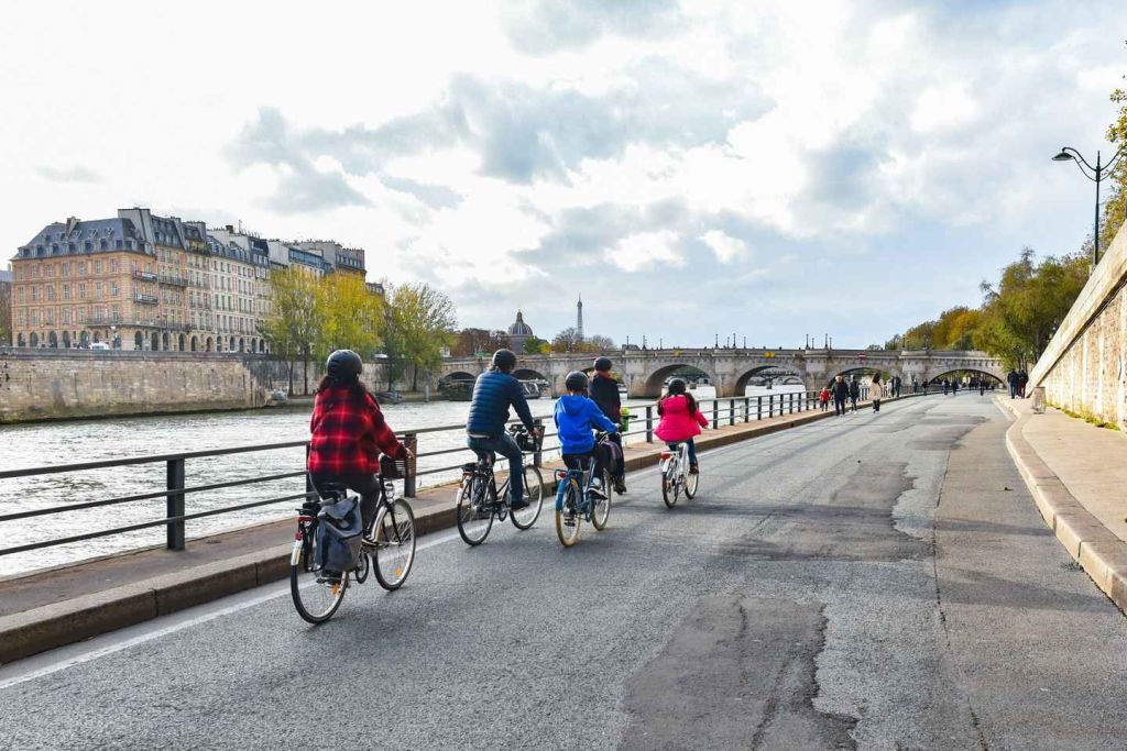 센강의 차량이 없는 자전거 전용 도로에서 안전하게 자전거를 타세요