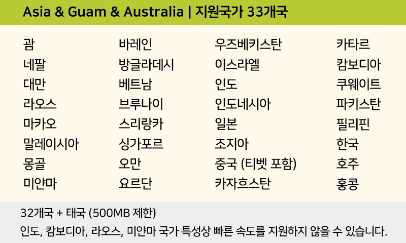 괌, 호주, 한국 포함 아시아 33개국 통합 이용 가능