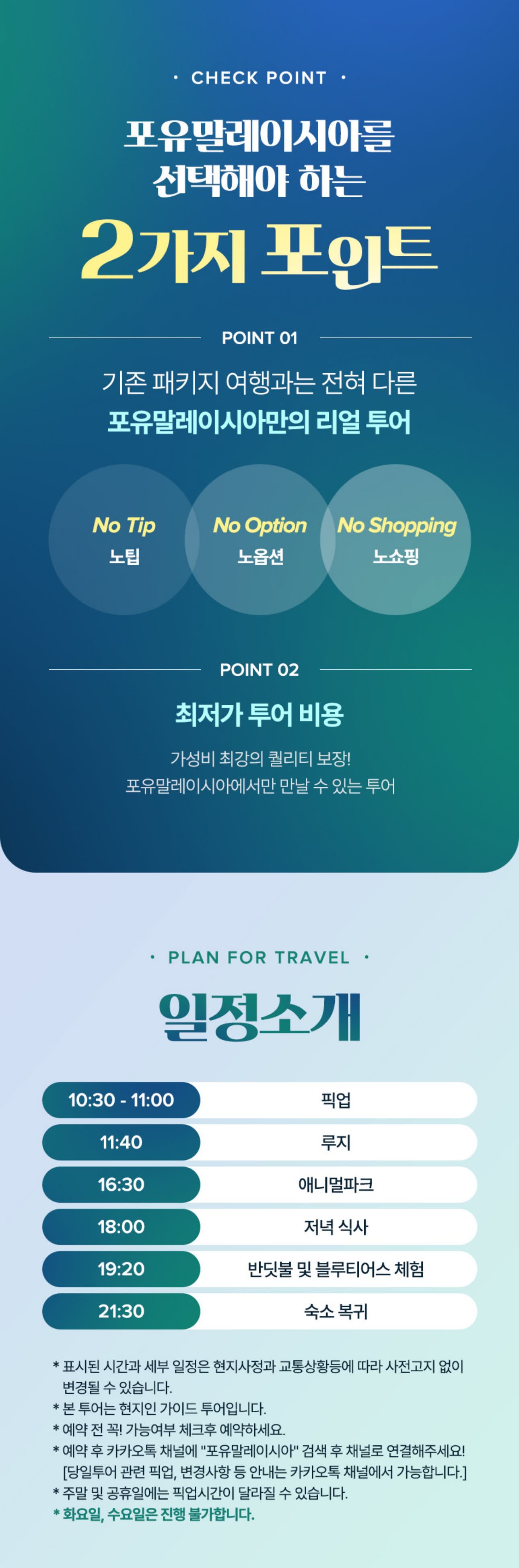 📌 예약 진행 및 관련 안내는 카카오톡 채널로 안내해드리고 있으니 꼭! 연결 부탁드립니다. (카톡 : '포유말레이시아'로 검색) 트리플 명시 후 투어명, 신청자명 남겨주세요. (화요일, 수요일은 투어 진행 불가합니다) 최소 출발 인원 기준 : 4명/출발일별 최소 출발 인원 미 충족 시 여행 표준 약관 제 9조에 따라 여행사는 여행 출발 7일 전까지 여행 계약을 일방적으로 해제하고 소비자에게 통보할 수 있습니다. 여행 참가자 수의 미달로 여행 개시 7일 전까지 출발 미확정되어 여행 계약 해지 통보 시 여행 신청금은 전액 환급됩니다. 👶🏻 [어린이 및 영아 기준] - 쿠알라룸푸르 투어 어린이 기준 미취학 아동 - 코타키나발루의 어린이 기준 만 12세 미만 - 영아 : 생후 24개월 미만에 해당(무료) / 동반 여부 확인 ※ 투어 공통 기준이긴 하나, 투어마다 적용은 다를 수 있습니다.