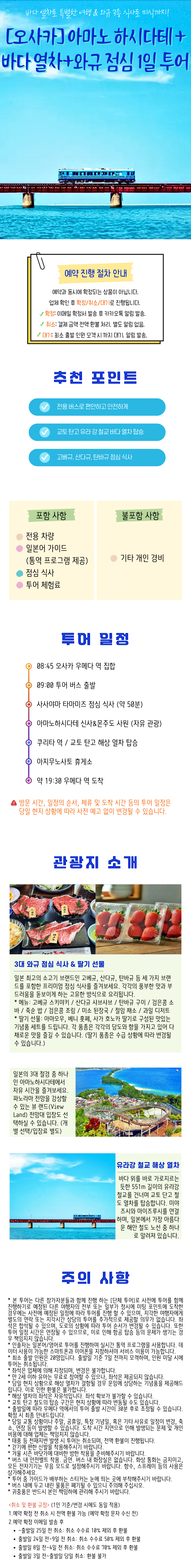 오사카 출도착! 편리한 버스 투어입니다. 아마노하시다테와 유라강 해상 열차로 바다 풍경응 감사해보세요. 3대 와규로 구성된 점심 식사로 미식 투어까지! 이색 1일 버스 투어입니다.