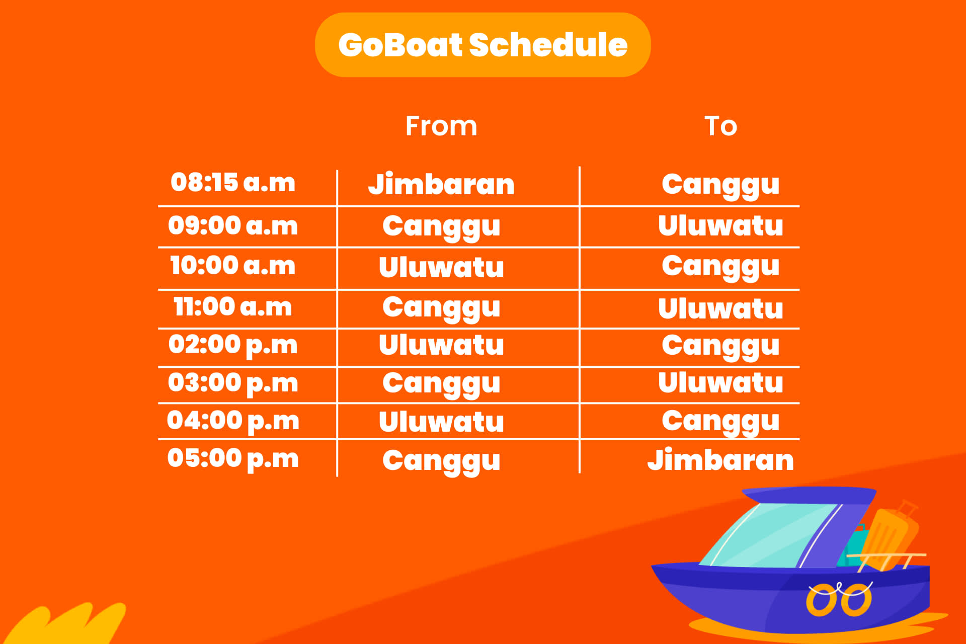 * GoBoat.id와 함께 짱구, 울루와뚜, 짐바란을 더욱 편리하게 여행하세요. * 보트 탑승으로 발리 지역을 더욱 빠르게 이동하고 교통 체증을 피하세요. * 반려동물과 함께 보트 이동을 즐길 수 있습니다!