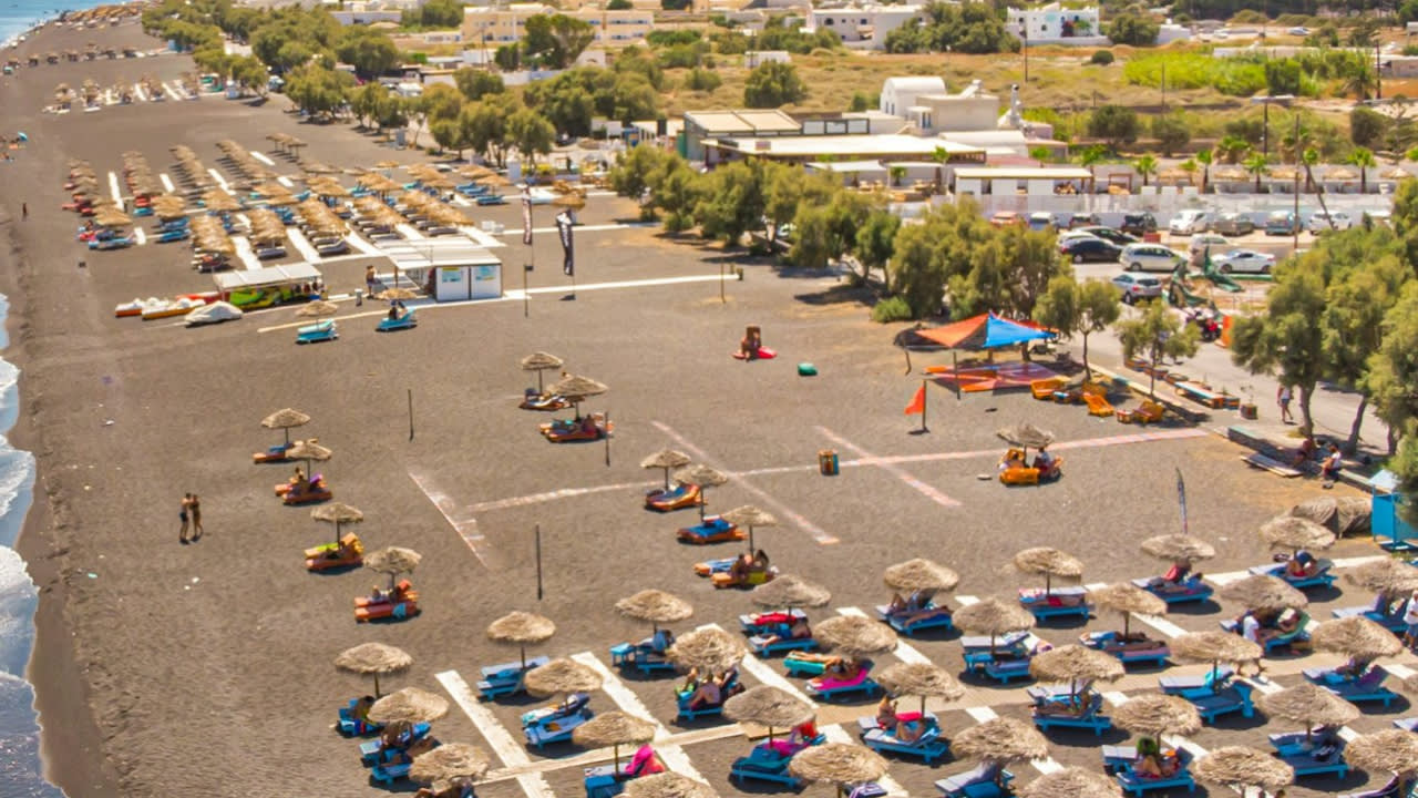* 화산 지형의 신비로운 검은 모래가 펼쳐진 페리사 해변에서 수영하며 휴식을 취해보세요.