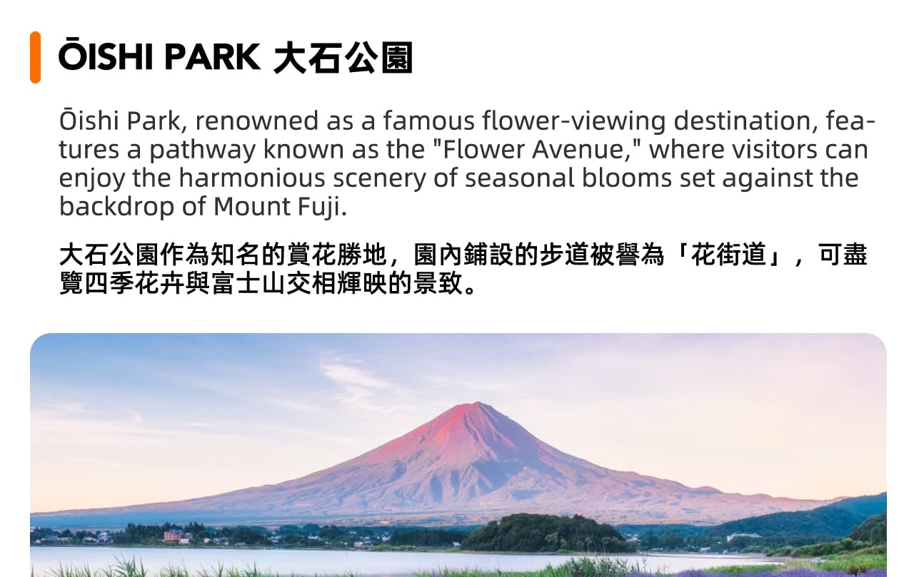 점심 식사 후 오이시 공원으로 이동하여 사계절 꽃길을 따라 산책하고 꽃에 둘러싸여 후지산의 전경을 감상하며 자연과 성산이 어우러진 아름다움을 느껴보세요.