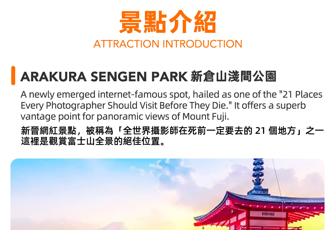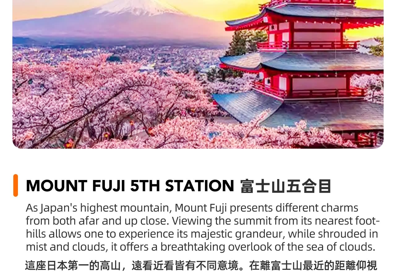 도쿄에서 출발하여 사계절에 맞는 후지산 여행을 떠나보세요. 번거로운 교통 계획 없이 성산과 전원의 즐거움을 한 번에 누릴 수 있습니다.
