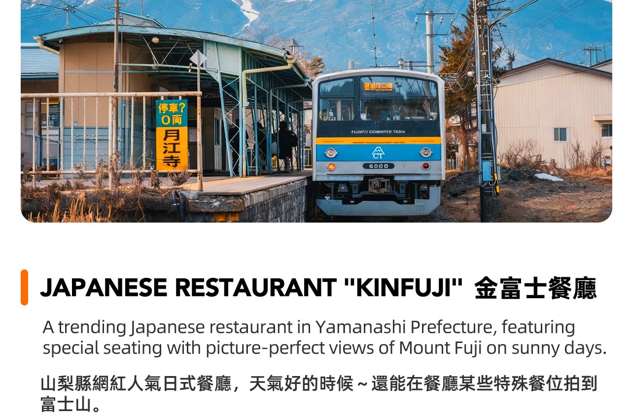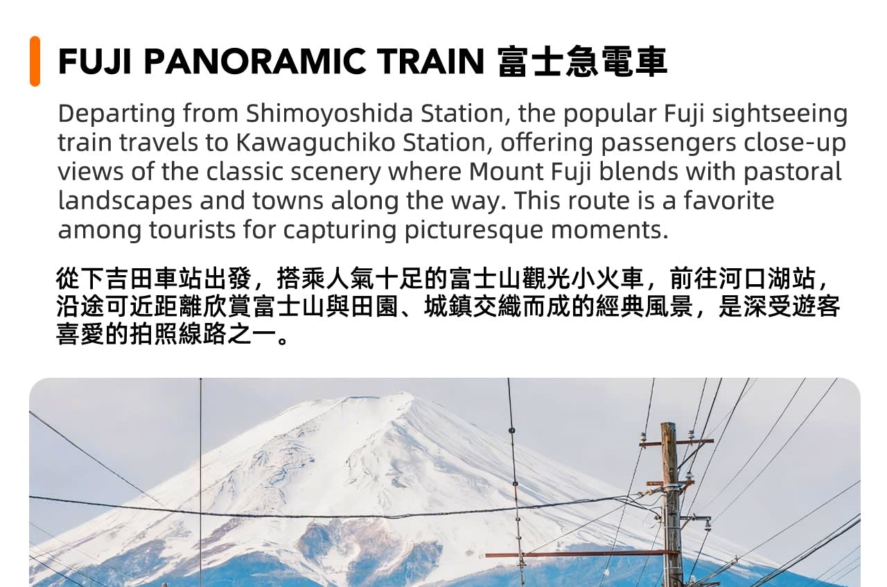 이 여정에는 후지산 인기 전철 티켓이 포함되어 있습니다. 시모요시다역에서 전철을 타고 14분 동안 아름다운 구간을 달리며 창밖으로 흐르는 후지산의 빛과 그림자를 감상하고 인기 있는 치유 여행을 경험해보세요.