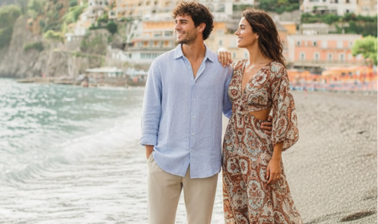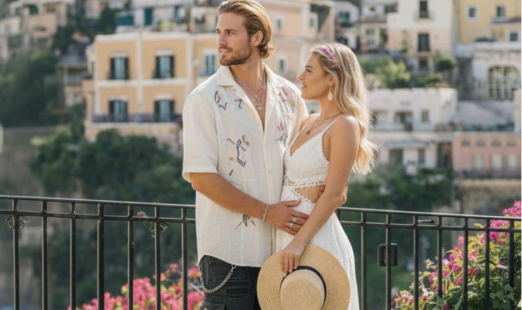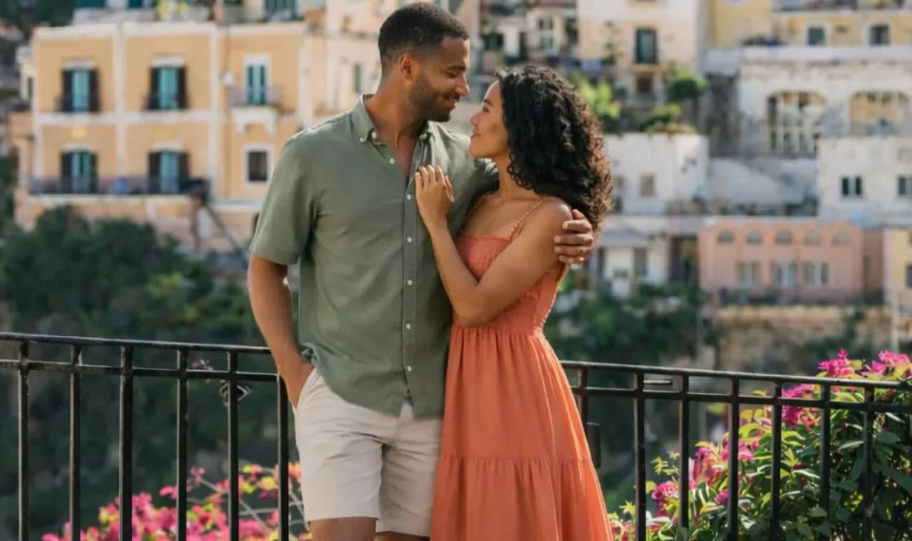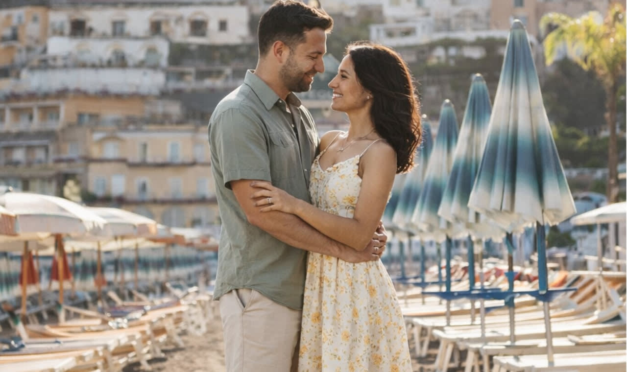* 포지타노의 다채로운 절벽 위 집들을 멋진 지중해 배경으로 삼아 자연스럽고 햇살 가득한 인물 사진을 촬영하세요.