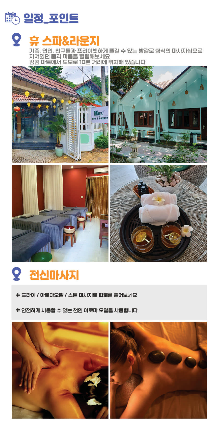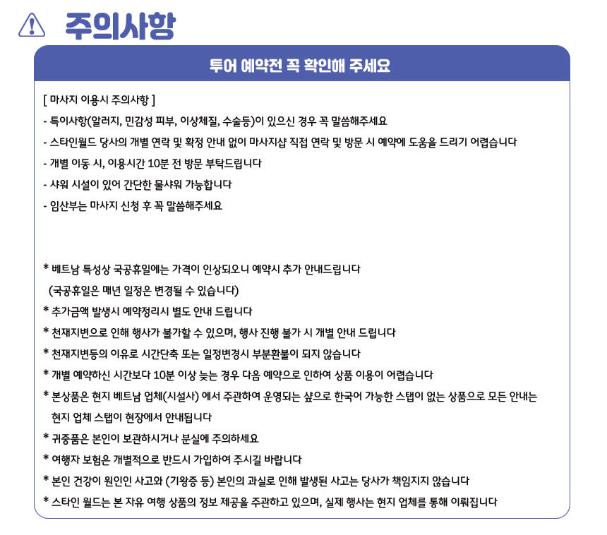 1. 베트남 특성상 하기 국공휴일에는 가격이 인상되오니 예약시 채널 확인 해주세요 2. 상품가의 약 15~30% 가량 인상 예정 (출발 7일전 최종 안내 가능) ✔ 국공휴일 예정 기간 ※ 신정 2025년 1월 1일 ※ 뗏기간 2025년 1월 27일 ~ 2월 2일 ※ 훙왕기념일 2025년 4월 5일 ~ 4월 7일 ※ 노동절 2025년 4월 30일 ~ 5월 4일 ※ 독립기념일 2025년 8월 30일 ~ 9월 2일 [ 마사지 이용시 주의사항 ] - 특이사항(알러지, 민감성 피부, 이상체질, 수술등)이 있으신 경우 꼭 말씀해주세요. - 본 마사지는 픽업 및 드랍이 없는 개별 이동 상품입니다. 예약시간에 맞쳐 방문 바랍니다. - 얼굴을 원치 않으실 분은 현장에서 스탭에게 꼭 말씀해주세요. 다른 코스로 보충해드립니다 - 임산부는 마사지 신청 후 꼭 말씀해주세요.