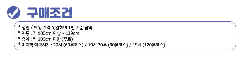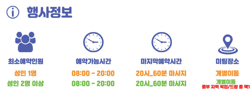 - 마지막 예약시간 : 20시 (60분코스) / 19시 30분 (90분코스) / 19시 (120분코스)