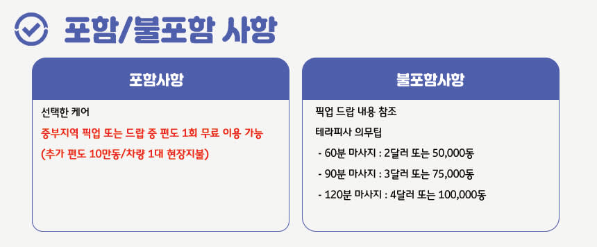 * 중부지역 픽업 또는 드랍 중 편도 1회 무료 이용 가능 (추가 편도 10만동/차량1대 현장지불)