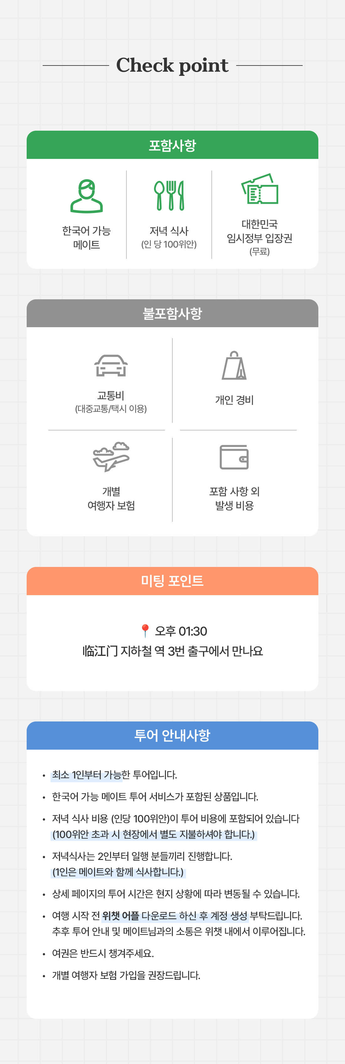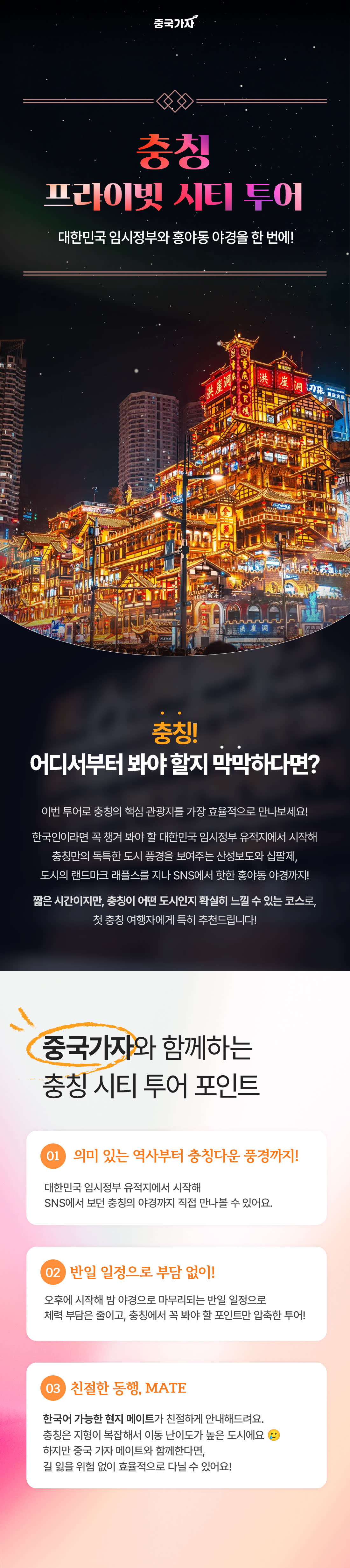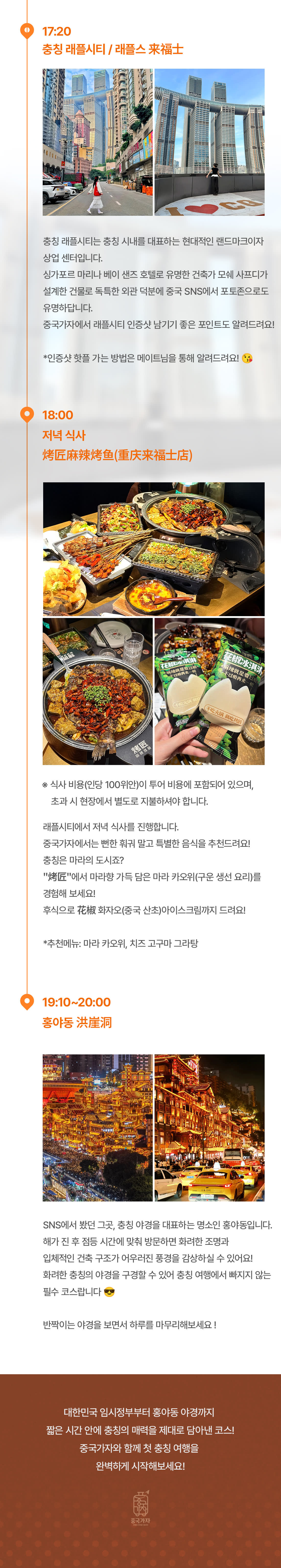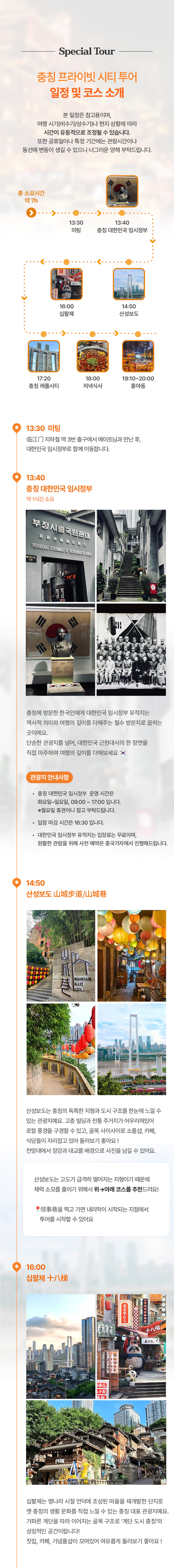 [안내사항] ✅️상품 안내 - 최소 1인부터 가능한 투어입니다. - 한국어 가능 메이트 투어 서비스가 포함된 상품입니다. - 저녁 식사 비용 (인당 100위안)이 투어 비용에 포함되어 있습니다. (100위안 초과 시 현장에서 별도 지불하셔야 합니다.) - 저녁식사는 2인부터 일행 분들끼리 진행합니다. (1인은 메이트와 함께 식사합니다.) - 상세 페이지의 투어 시간은 현지 상황에 따라 다소 변동될 수 있습니다. - 여행 시작 전 위챗 어플 다운로드 하신 후 계정 생성 부탁드립니다😉 추후 투어 안내 및 메이트님과의 소통은 위챗 내에서 이루어집니다. - 여권은 반드시 챙겨주세요. - 개별 여행자 보험 가입을 권장드립니다. ✅️주요 관광지 안내 - 충칭 대한민국 임시정부 운영 시간은 화요일~일요일, 09:00 ~ 17:00 입니다. 📢월요일 휴관이니 참고 부탁드립니다. - 입장 마감 시간은 16:30 입니다.