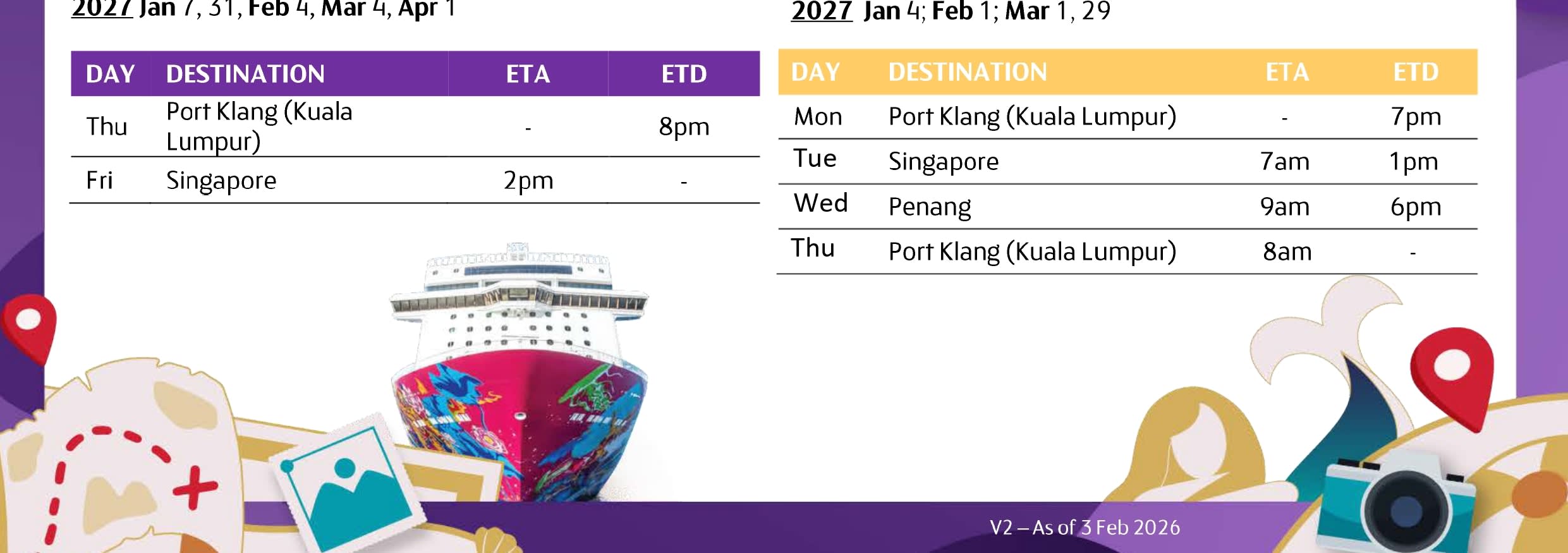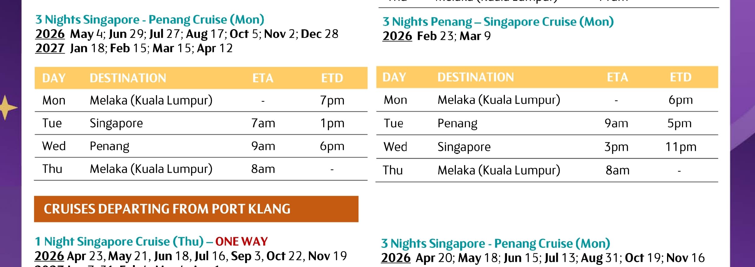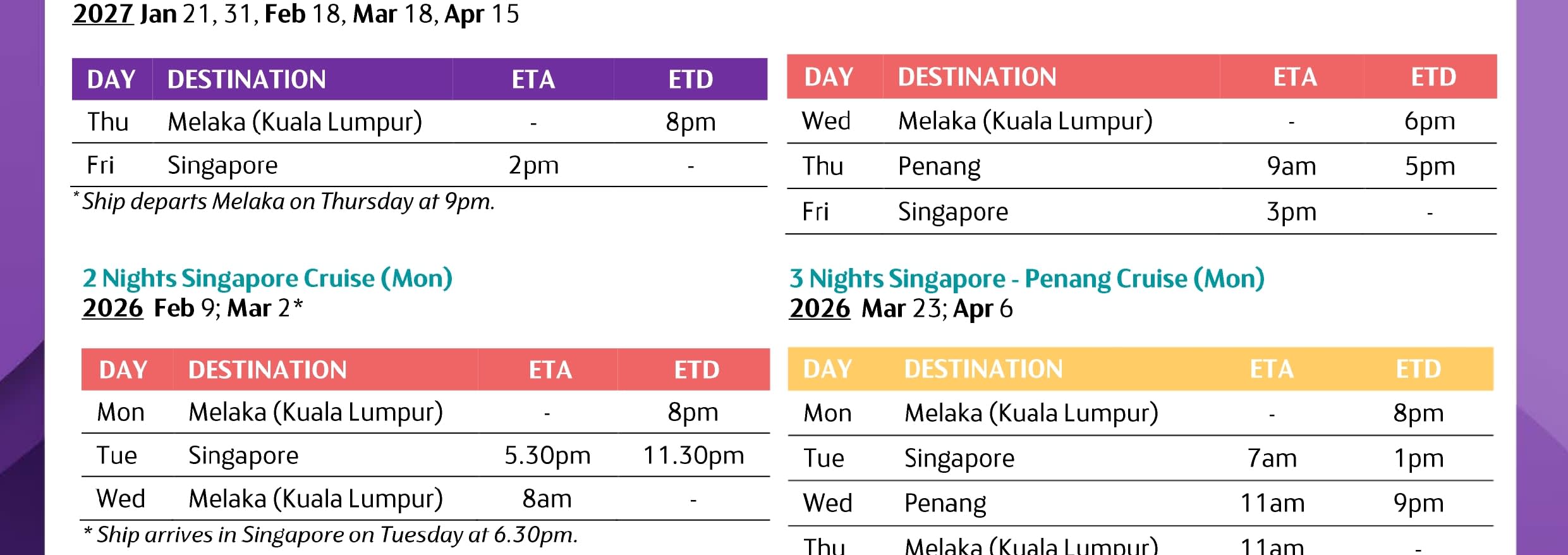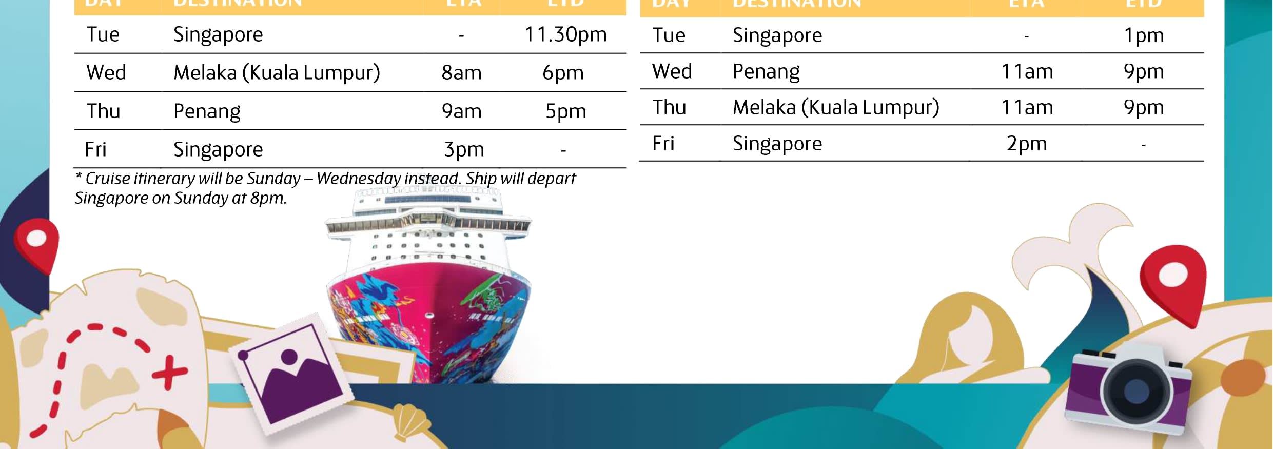- 특별한 동남아시아 크루즈 여행 일반적인 2박 주말 크루즈 외에도, 싱가포르 마리나 베이 크루즈 센터 또는 말라카에서 출발하는 3~4일간의 특별한 여정이 있습니다. 이 여정에는 쿠알라룸푸르, 페낭, 푸켓을 포함한 말레이시아와 태국의 항구에 정박합니다. - 싱가포르 출발 * 2박 말라카 (일요일) * 3박 말라카 & 페낭 (화요일) * 3박 푸켓 (화요일) - 말라카 출발 * 2박 싱가포르 크루즈 (월요일) * 3박 싱가포르 - 페낭 크루즈 (월요일) 선박에 탑승하신 후 예약할 수 있는 기항지 관광에 참여하실 수 있습니다.