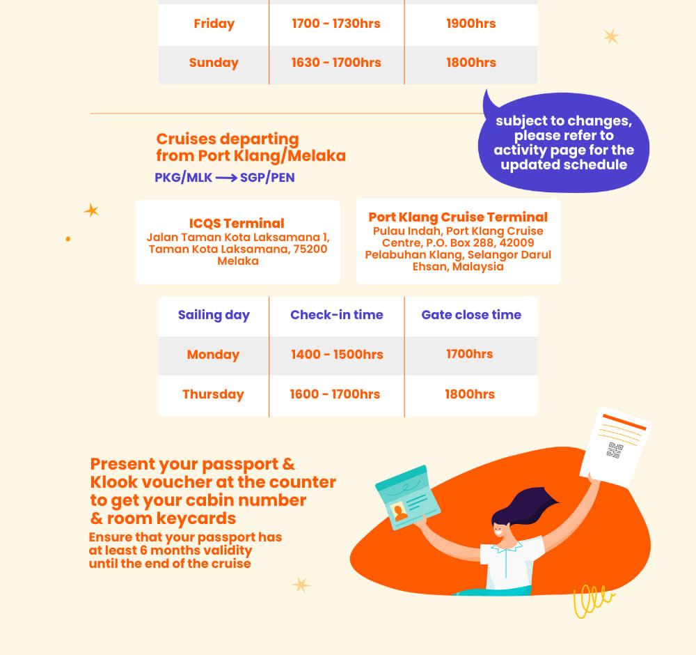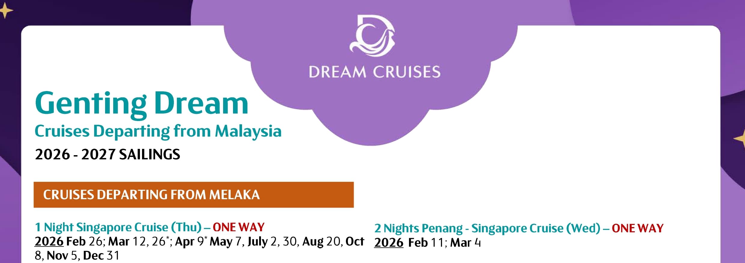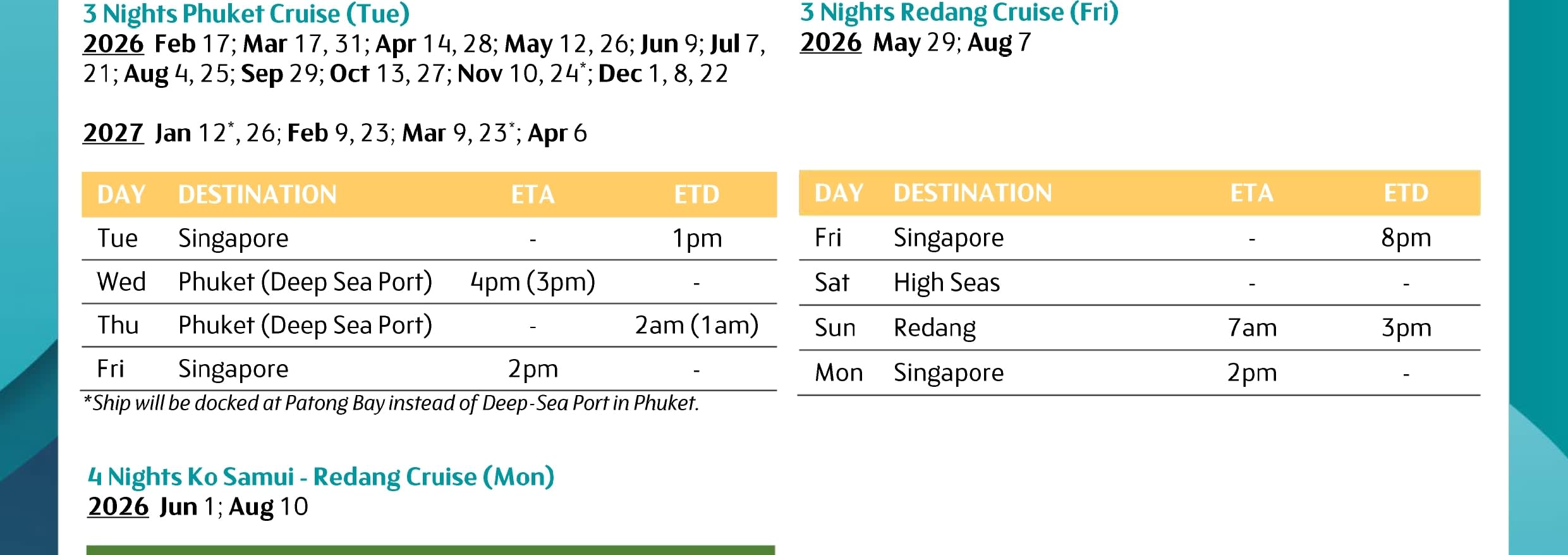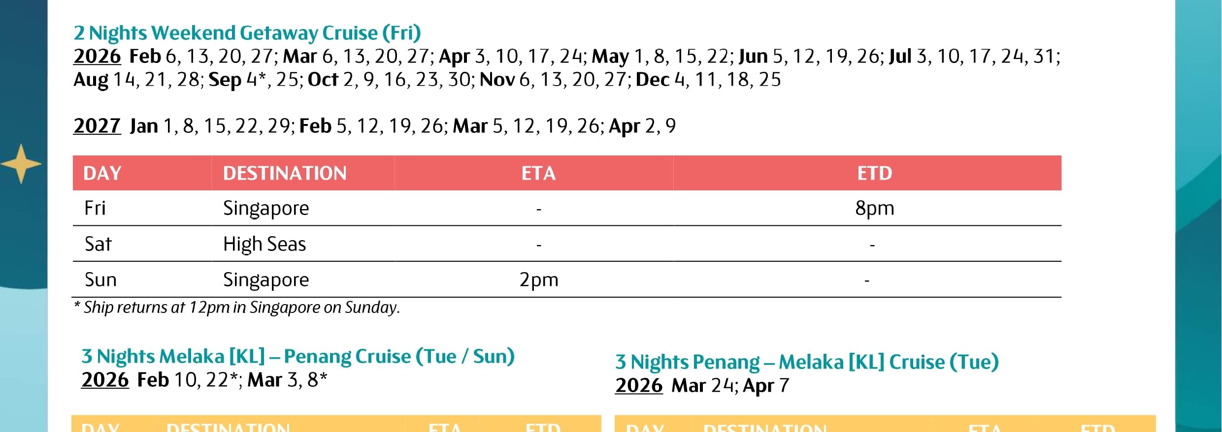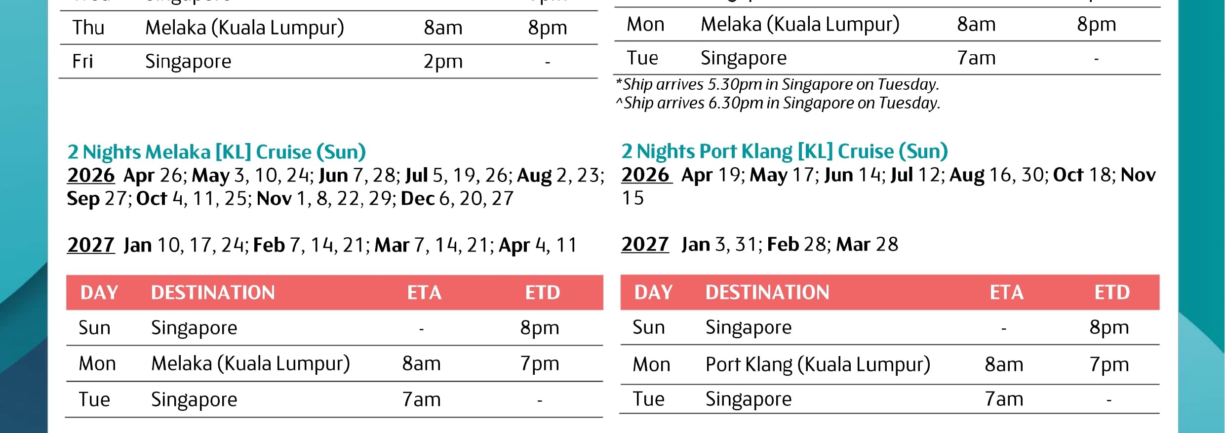 - 특별한 동남아시아 크루즈 여행 일반적인 2박 주말 크루즈 외에도, 싱가포르 마리나 베이 크루즈 센터 또는 말라카에서 출발하는 3~4일간의 특별한 여정이 있습니다. 이 여정에는 쿠알라룸푸르, 페낭, 푸켓을 포함한 말레이시아와 태국의 항구에 정박합니다. - 싱가포르 출발 * 2박 말라카 (일요일) * 3박 말라카 & 페낭 (화요일) * 3박 푸켓 (화요일) - 말라카 출발 * 2박 싱가포르 크루즈 (월요일) * 3박 싱가포르 - 페낭 크루즈 (월요일) 선박에 탑승하신 후 예약할 수 있는 기항지 관광에 참여하실 수 있습니다.