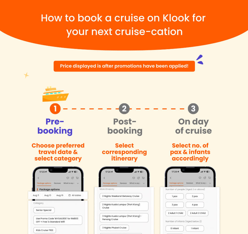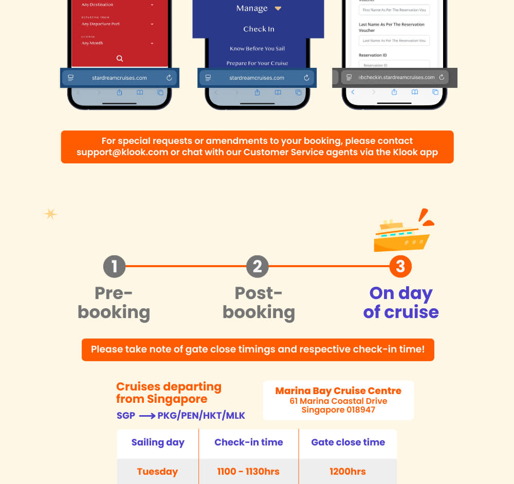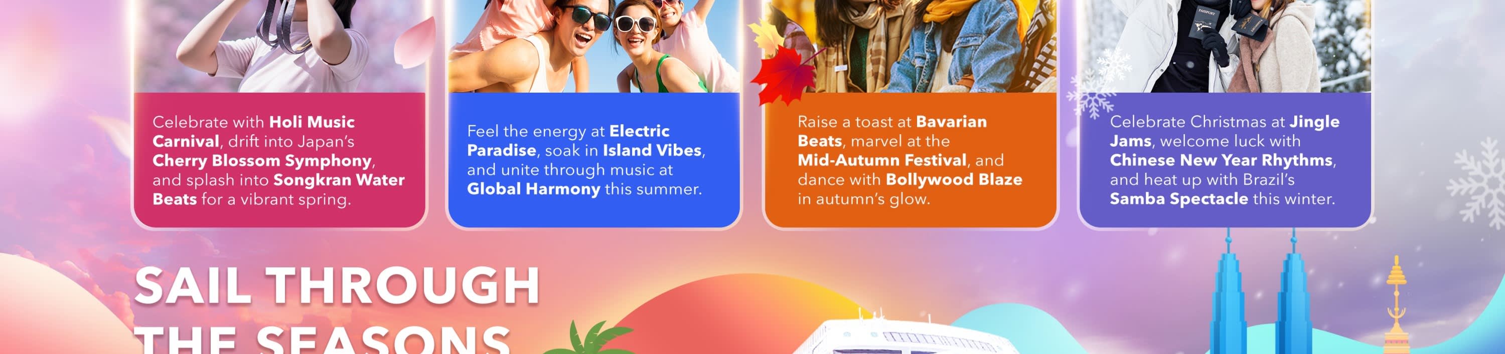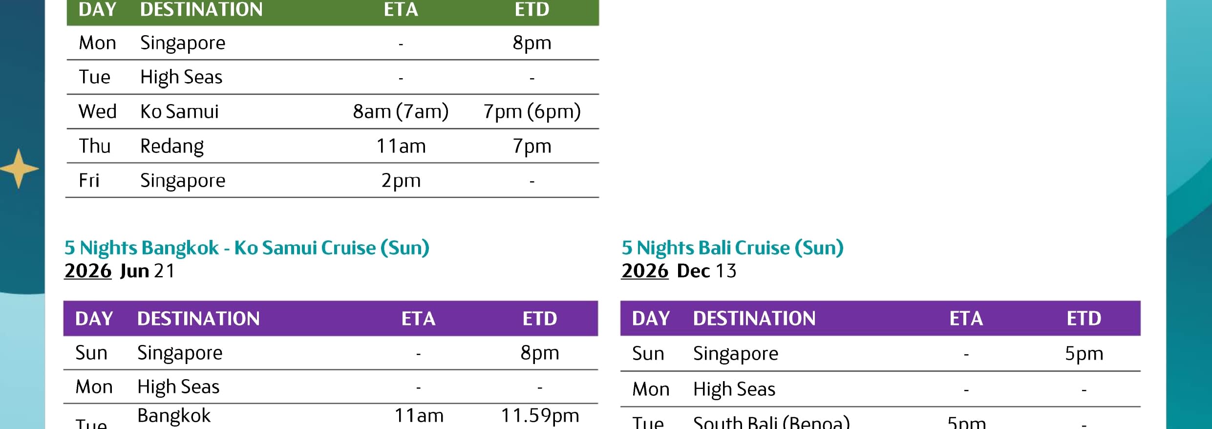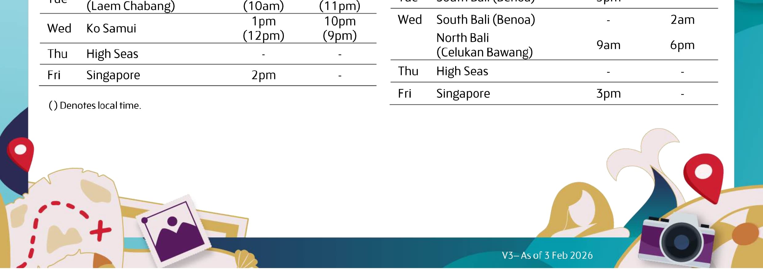 - 특별한 동남아시아 크루즈 여행 일반적인 2박 주말 크루즈 외에도, 싱가포르 마리나 베이 크루즈 센터 또는 말라카에서 출발하는 3~4일간의 특별한 여정이 있습니다. 이 여정에는 쿠알라룸푸르, 페낭, 푸켓을 포함한 말레이시아와 태국의 항구에 정박합니다. - 싱가포르 출발 * 2박 말라카 (일요일) * 3박 말라카 & 페낭 (화요일) * 3박 푸켓 (화요일) - 말라카 출발 * 2박 싱가포르 크루즈 (월요일) * 3박 싱가포르 - 페낭 크루즈 (월요일) 선박에 탑승하신 후 예약할 수 있는 기항지 관광에 참여하실 수 있습니다.