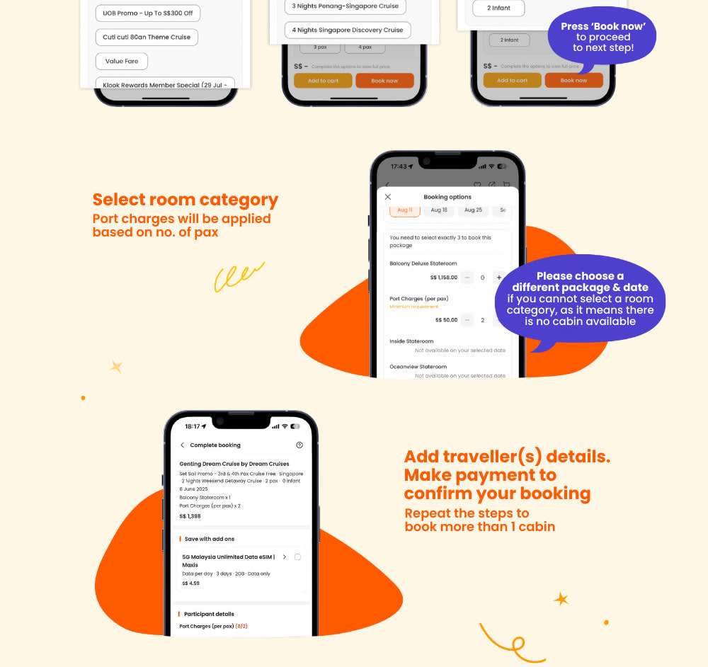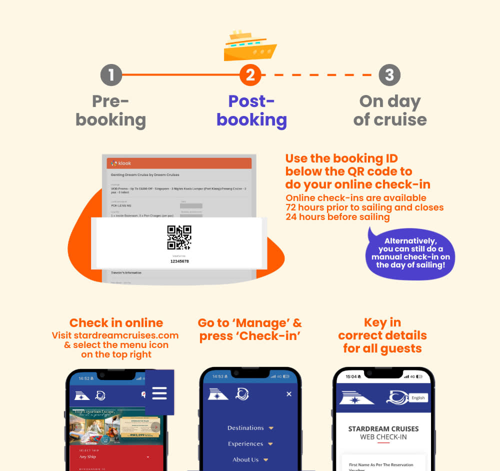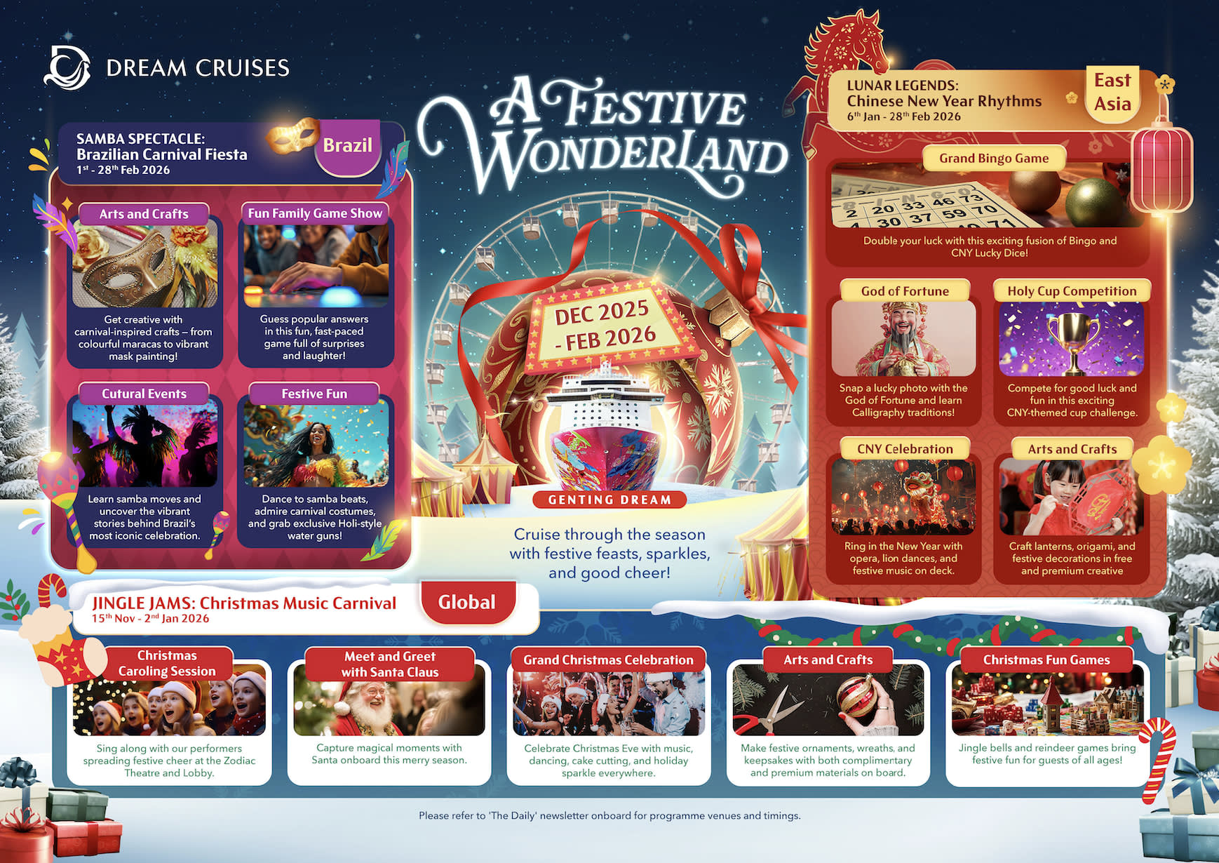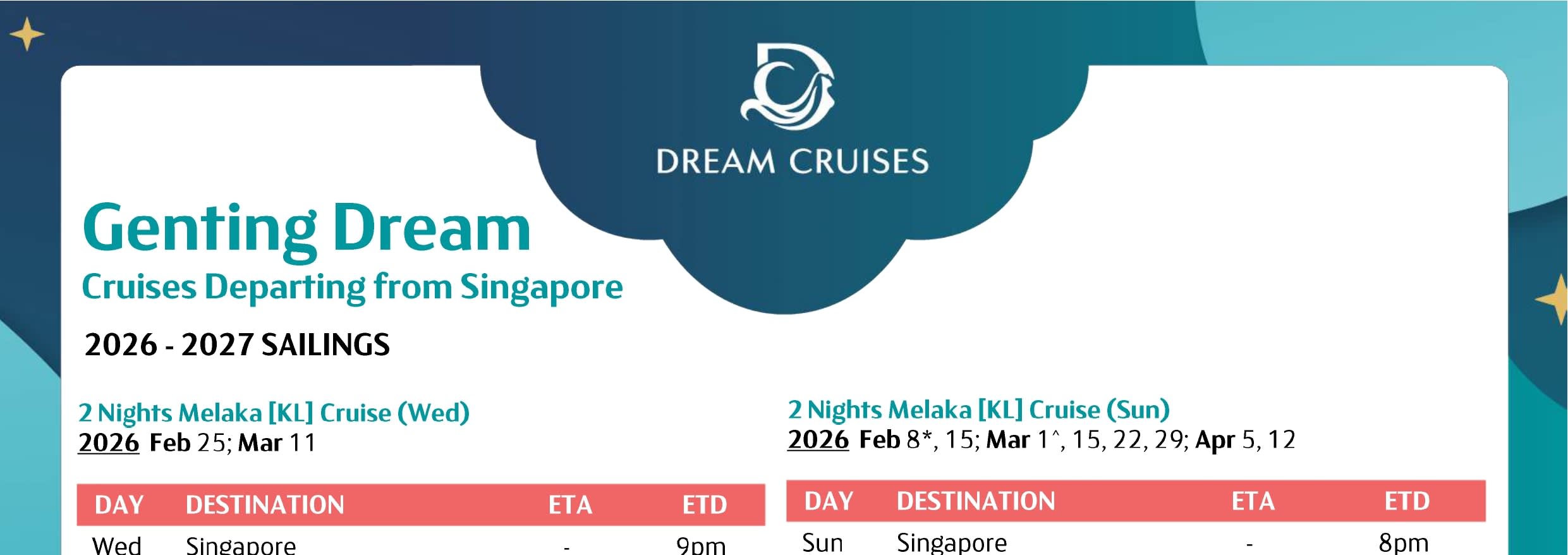 - 겐팅 드림호 브로슈어 - 싱가포르 크루즈 선사 이 싱가포르 크루즈는 드림 크루즈에서 운영합니다. 겐팅 드림 크루즈 선박에 탑승하여 특별한 바다 위 휴가를 경험하실 수 있습니다. - 성수기 성수기 예약은 100% 확정됩니다. 취소는 불가합니다. 성수기 출항: 2026년 2월 17일 - 여행자 보험 크루즈를 예약하신 경우 여행자 보험 가입을 적극 권장합니다. 이는 의료상의 이유로 인한 크루즈 취소 시 보장해 드립니다. - 입국 심사 요건 입국 심사 요건에 유의해 주십시오. 외국인 승객은 방문할 국가에 따라 본인의 비자 요건을 확인해야 합니다. 승객은 여행 서류에 대한 가장 정확하고 최신 정보를 얻기 위해 해당 국가의 공식 웹사이트를 참조하는 것이 좋습니다. - 싱가포르 비자 요건: * 유효기간이 6개월 이상 남은 여권 * 싱가포르 도착 전 온라인으로 SG Arrival Card 제출 * 확정된 크루즈 티켓 * 아프리카, 남미의 영향을 받은 국가에서 도착하는 경우 황열병 예방접종 증명서 - 말레이시아 비자 요건 * Shorex 이용 시 비자 불필요 (이스라엘 시민 제외) * 이스라엘 시민은 상륙 불가 - 태국 비자 요건 * 도착 비자 및 입국 심사 수수료는 총 108SGD입니다. * 태국 도착 3일 이내에 온라인으로 태국 디지털 도착 카드(TDAC) 제출 - 인도네시아 비자 요건 * 모든 크루즈 승객은 발리 관광세로 150,000 IDR (13 SGD 상당)을 지불해야 하며, 이는 선상에서 지불됩니다. 팁 - 팁은 선상에서 지불됩니다. * 내측 객실에서 오션뷰 객실: 1인당 1박 SGD$27 * 발코니 객실: 1인당 1박 SGD$33 * 팰리스 스위트에서 팰리스 빌라: 1인당 1박 SGD$40 표시된 가격 - - 표시된 모든 가격은 할인 후 가격입니다. * 요금은 유동적이며, 예약이 즉시 확정되지 않을 경우 가격 변동이 있을 수 있습니다. * 한 객실에 숙박하는 총 승객 수를 선택해 주세요. 체크인 - - https://webcheckin.stardreamcruises.com/를 방문하여 필수 온라인 체크인을 진행하고 세부 정보를 정확하게 입력해 주세요. 참고: 온라인 체크인은 출발 48시간 전에 마감됩니다. 온라인 체크인을 할 수 없는 경우, 출항 당일 수동 체크인을 할 수 있습니다. * 객실 번호와 객실 키 카드는 카운터에서만 받을 수 있습니다. * 게이트 마감 시간, 체크인 시간, 선박 하선 시간을 확인해 주세요. - 2박 주말 여행을 제외한 모든 크루즈 일정의 경우, 항구에서 자유롭게 하선하여 여행할 수 있습니다. 기항지 관광 패키지는 선상에 있는 기항지 관광 카운터에 문의해 주세요. 와이파이 패키지 - 선상에서 구매 가능합니다.