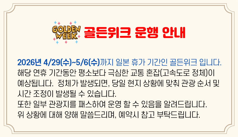 - 일본의 연휴, 기상, 도로정체, 버스 등의 이유로 투어 일정 및 시간 변경이 있을 수 있으며, 상황에 따라 코스 생략이 있을 수 있습니다. (투어 중 기상 악화로 인해 투어 진행이 불가능할 경우에는 환불 불가하며, 대체 가능한 일정으로 진행합니다.) - 버스 좌석은 선착순으로 착석이며, 만석인 경우에 동행인과 떨어져 앉을 수 있습니다. - 최초에 앉은 자리에서 일정이 마칠 때까지 동일하게 앉아주세요. - 현지 교통상황에 따라 투어 종료 시간이 늦어질 수 있습니다. - 그로 인해 비행기 탑승을 못하게 되어도 소소버스투어에서 책임을 지지 못해요. - 입국일/출국일 에는 버스투어를 하지 않는 것을 추천드립니다. - 장시간 투어로 인해 24개월 미만 영아는 탑승이 되지 않습니다.