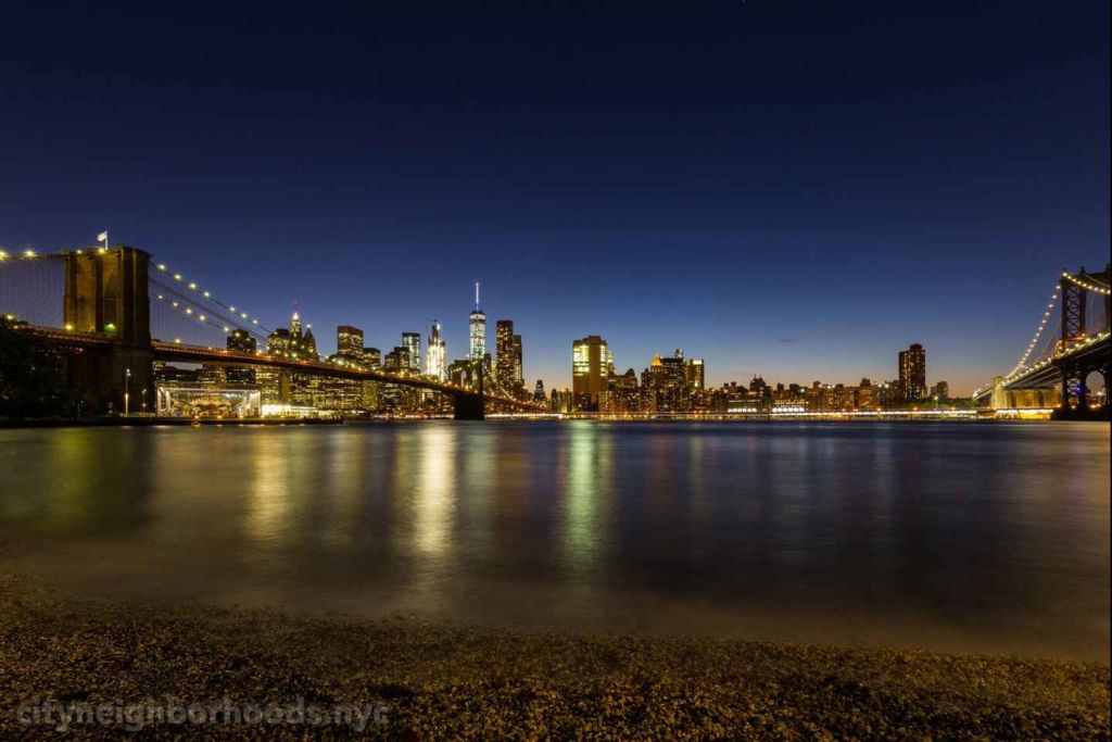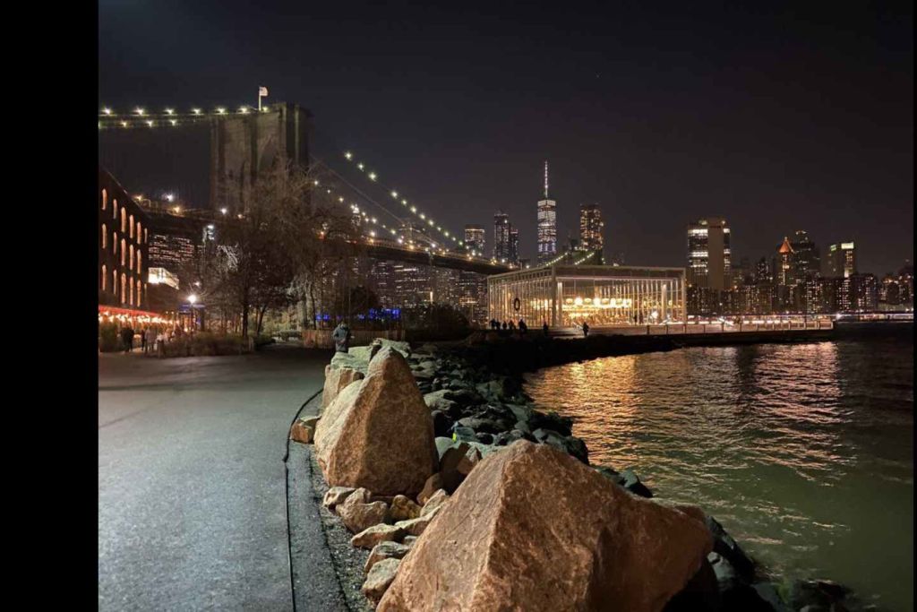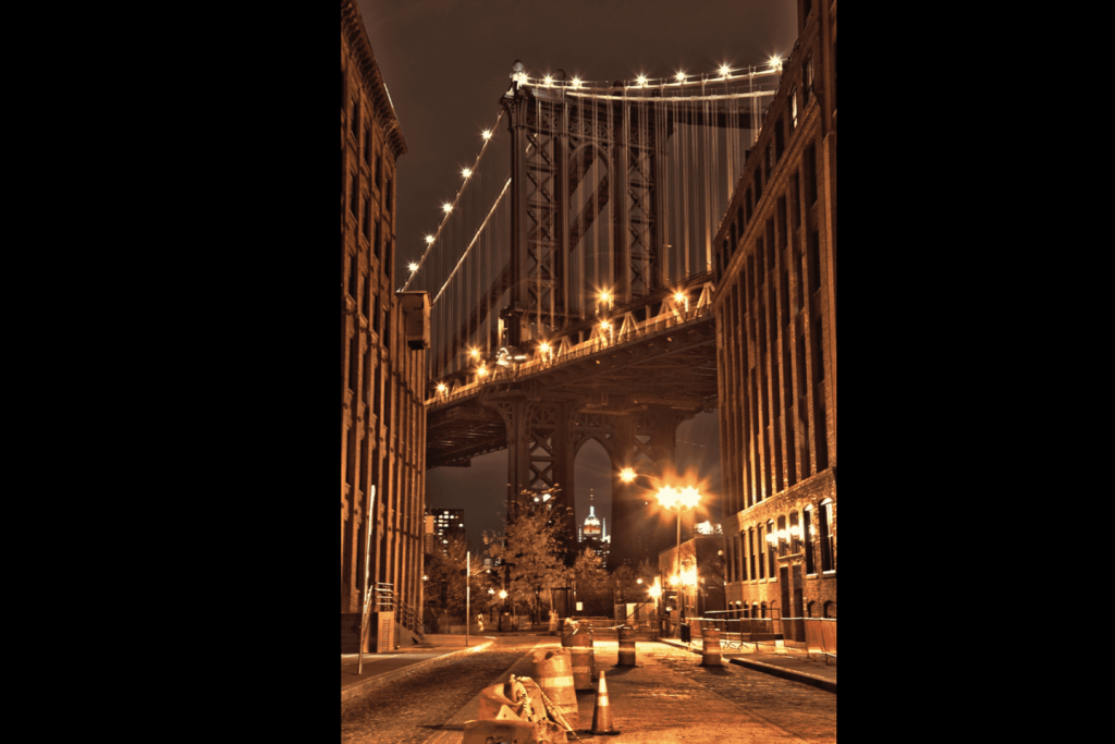 브루클린 다리를 건너 덤보의 조약돌 거리에서 역사적인 건물에 반짝이는 홀리데이 조명과 반짝이는 스카이라인의 멋진 배경이 되는 브루클린 다리의 환상적인 광경을 감상하세요.