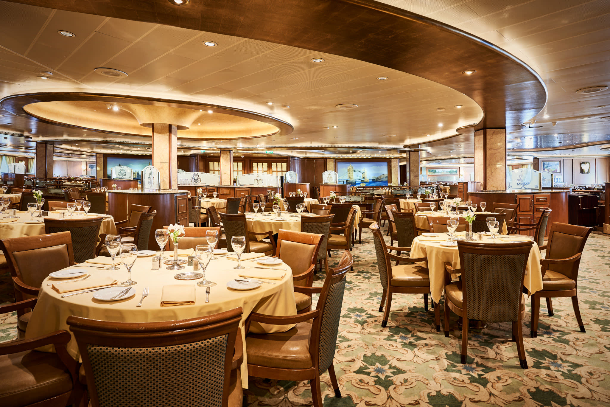 선박의 메인 레스토랑 외에도 24시간 Horizon Court 뷔페, 칵테일과 라이브 음악을 즐길 수 있는 Wheelhouse Bar, 클래식 마티니를 즐길 수 있는 Crooners Lounge & Bar와 같은 다양한 캐주얼 다이닝 옵션과 전문 장소도 있습니다. 재즈. 이렇게 다양한 식사 옵션을 이용할 수 있어 손님들은 자신의 취향과 기호에 맞는 것을 찾을 수 있을 것입니다.