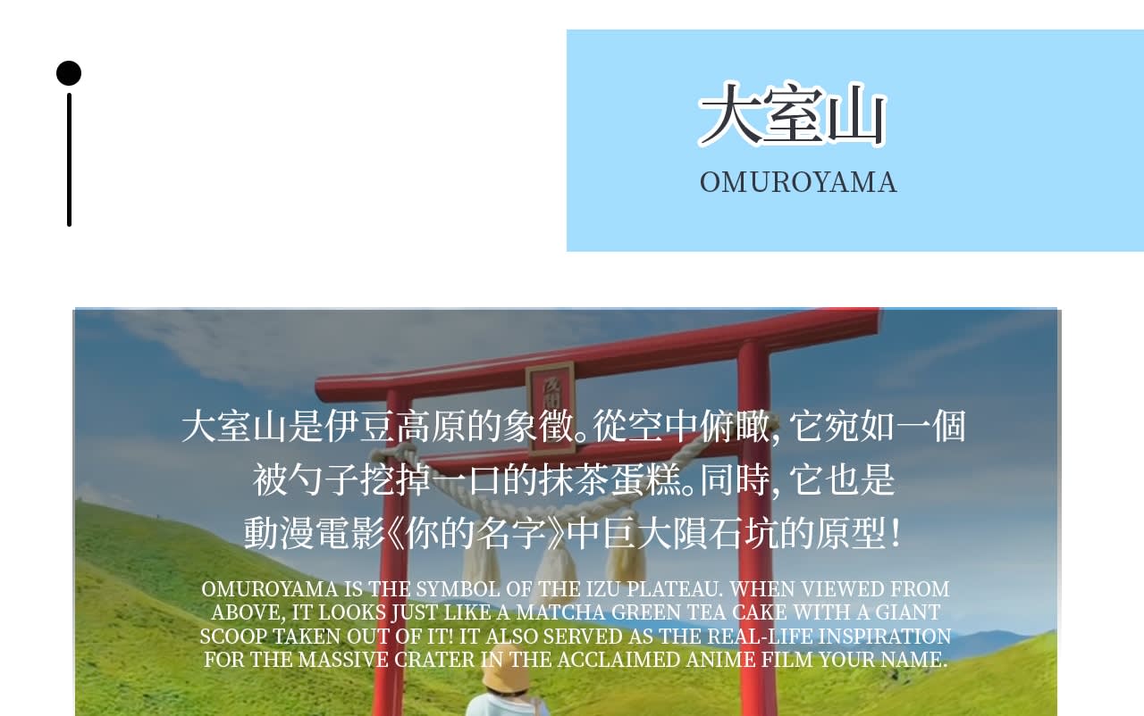 * 이즈 명산 체험: 오무로산에 올라 케이블카를 타고 이즈의 산들과 사가미만을 굽어보고, 분화구 산책로를 따라 걸으며 자연의 웅장한 경치를 감상하세요.