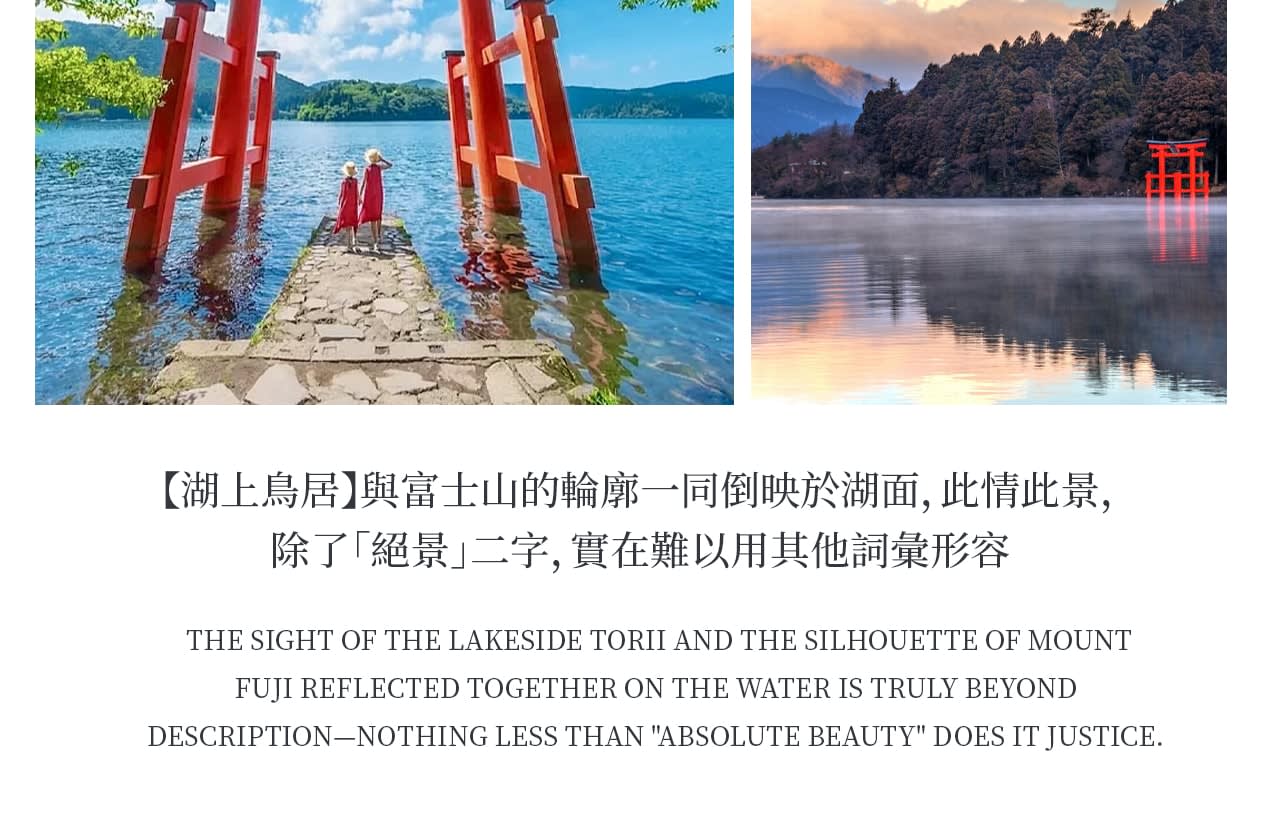 * 하코네 자연의 절경: 케이블카를 타고 오와쿠다니의 지열 경관을 굽어보고, 아시노코 호숫가에서 호수 위의 도리이와 후지산을 멀리서 바라보세요.